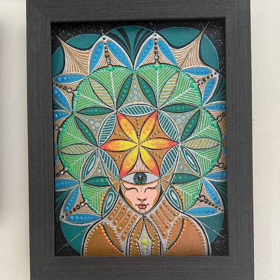 ET (Elena Telford) is a visionary artist based in San Francisco. Her unique, captivating art explores mysticism, spirituality, themes of creation, healing, growth and eternal absolute. Most of her paintings include and represent different dimensions: Physical (daylight), Mental (colors/black light), Absolute (darkness). Channeled in a state of trance, ET’s works serve as both a window and a bridge between worlds.   Products Details: Painting Size 9'' x 12'' Frame Size 11'' x 14'' Acrylic, Chrome Markers 3d UV Reactive / Glow in the dark Paint on Canvas