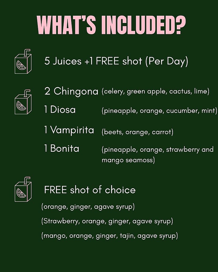 Each day of the cleanse includes 5 cold-pressed juices plus 1 FREE wellness shot of your choice.