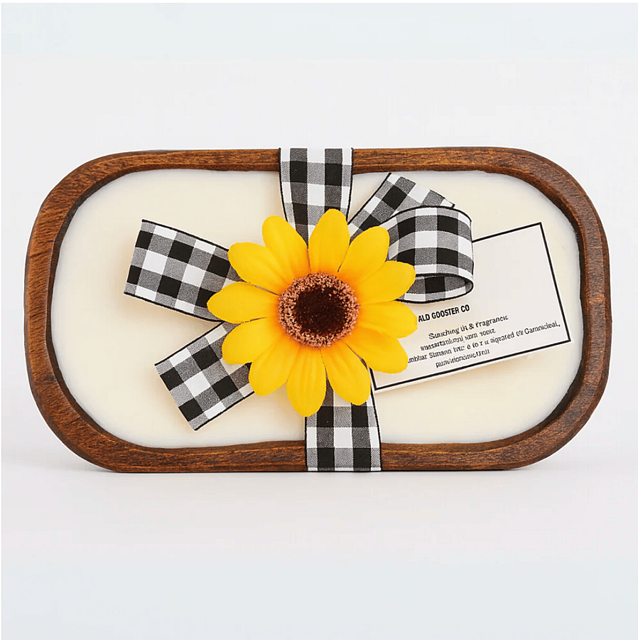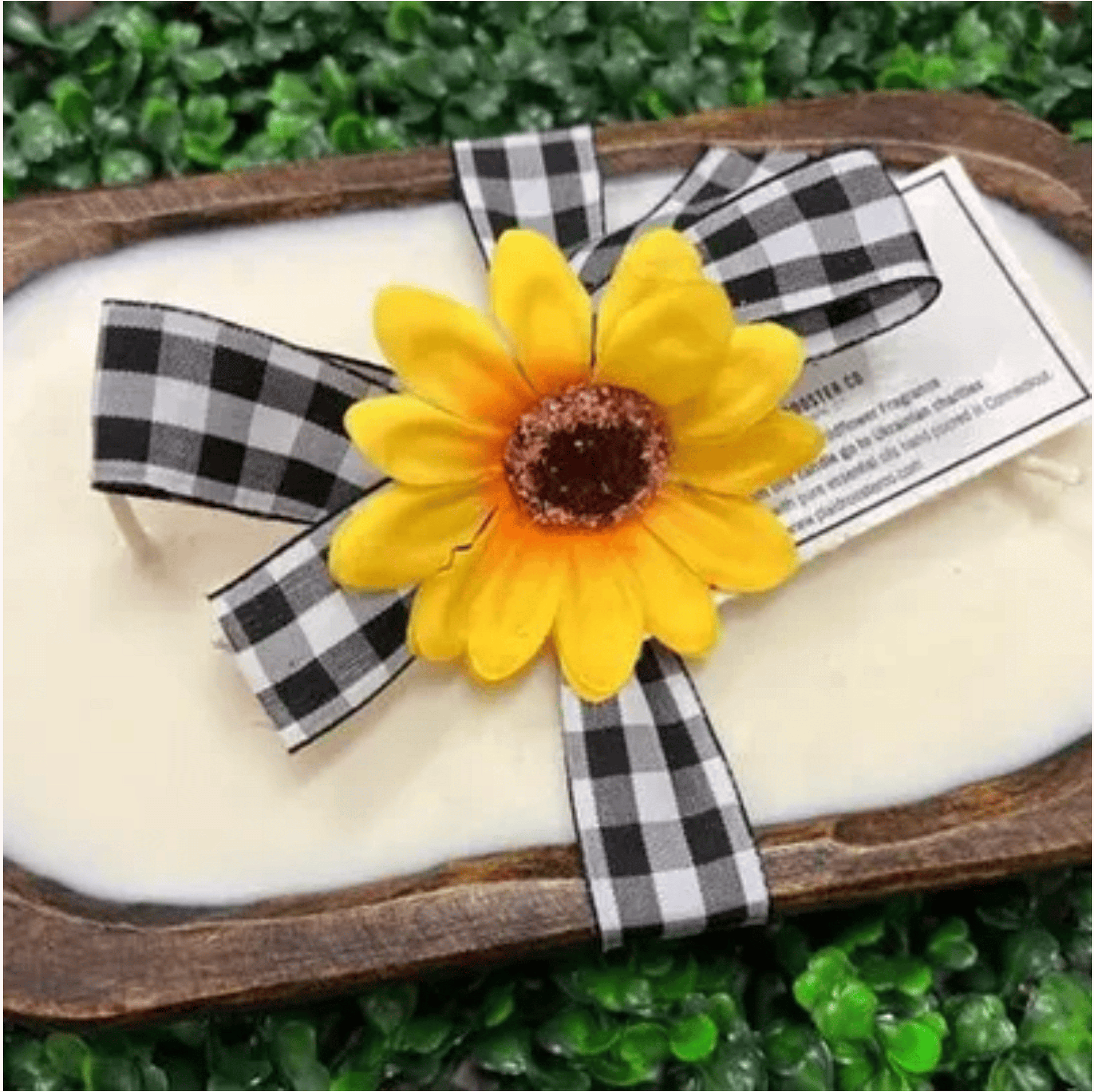 100% All-natural soy wax infused with our essential oil based fragrance "Sunflower Fields" then hand-poured into hand-carved wood dough bowl and accented with our signature buffalo plaid farmhouse ribbon and sunflower. 3 lead-free cotton wicks. No artificial dyes or toxic chemicals.