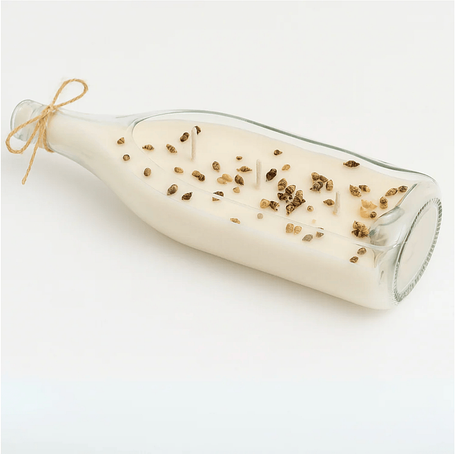 100% American farm grown soy wax infused with our signature essential oil-based fragrance hand-poured into recycled glass wine bottle with 3 cotton lead free wicks and accented with mini hermit shells.