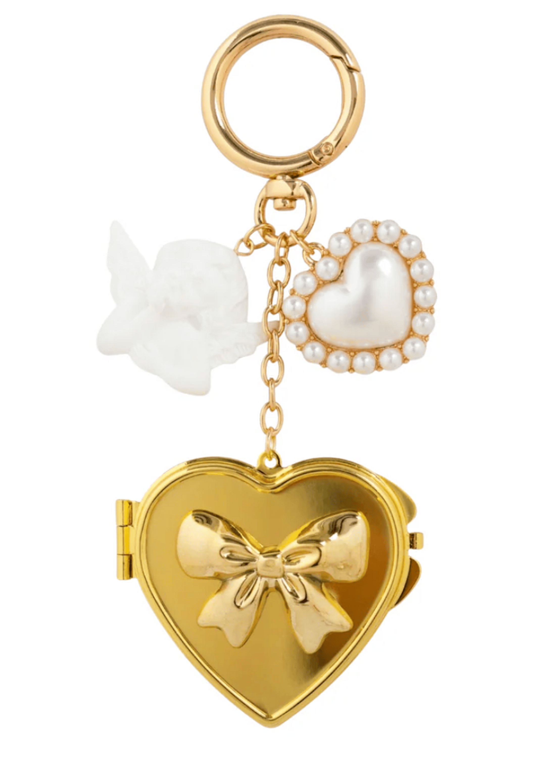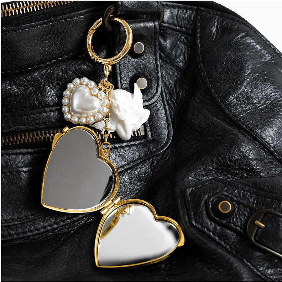 This vintage-inspired bag charm features a gold heart locket with a delicate bow design—open it to reveal a hidden mirror inside! Finished with a pearly heart charm and a sweet white cherub, it’s the perfect mix of elegance and whimsy for your bag or keys.