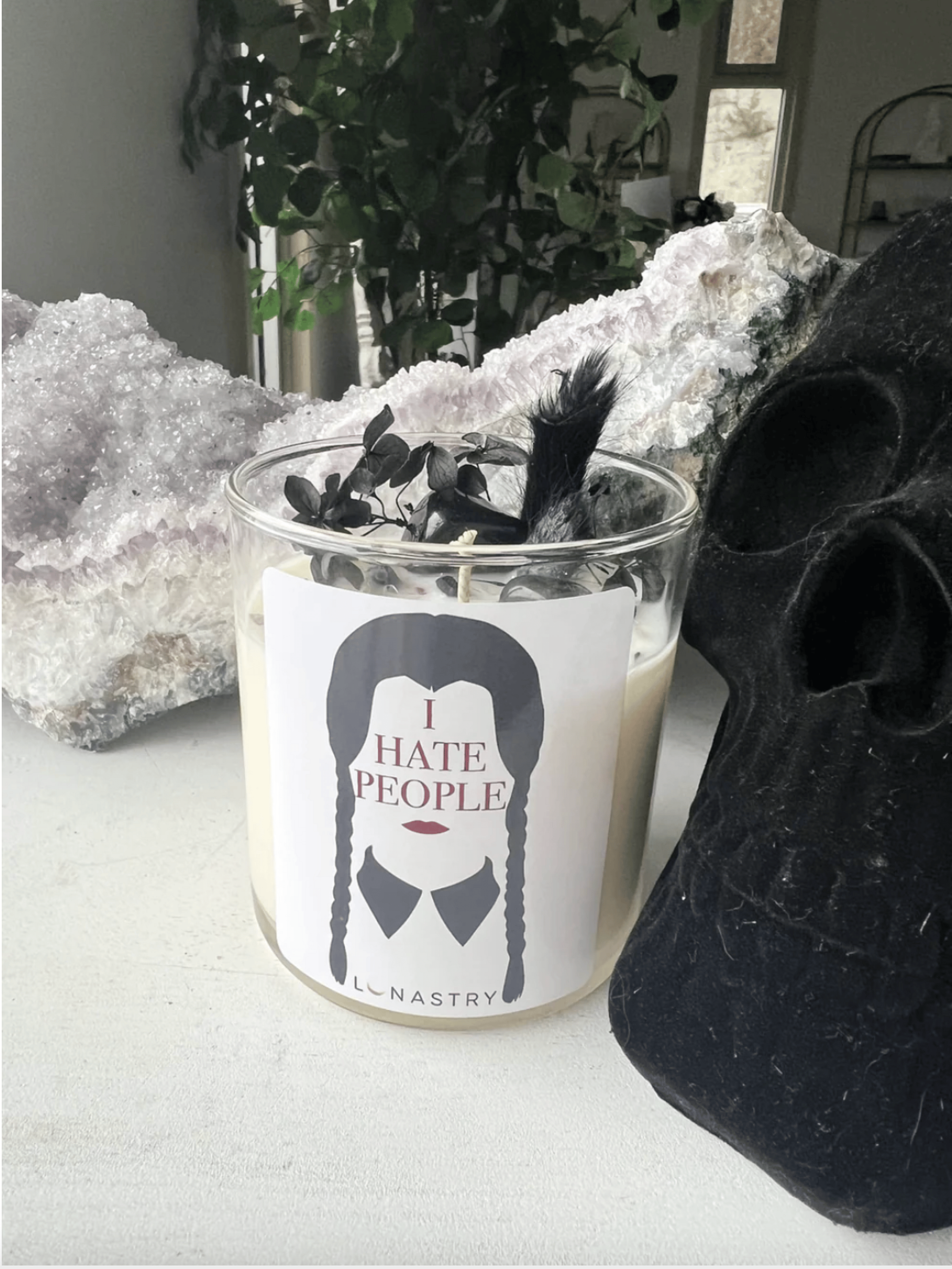 Channel your inner Wednesday Addams with this delightfully misanthropic candle. Perfect for setting a brooding atmosphere while silently judging everyone around you. The dark, moody scent pairs perfectly with thunderstorms, sarcastic remarks, and solitary evenings away from the unbearable presence of other humans.