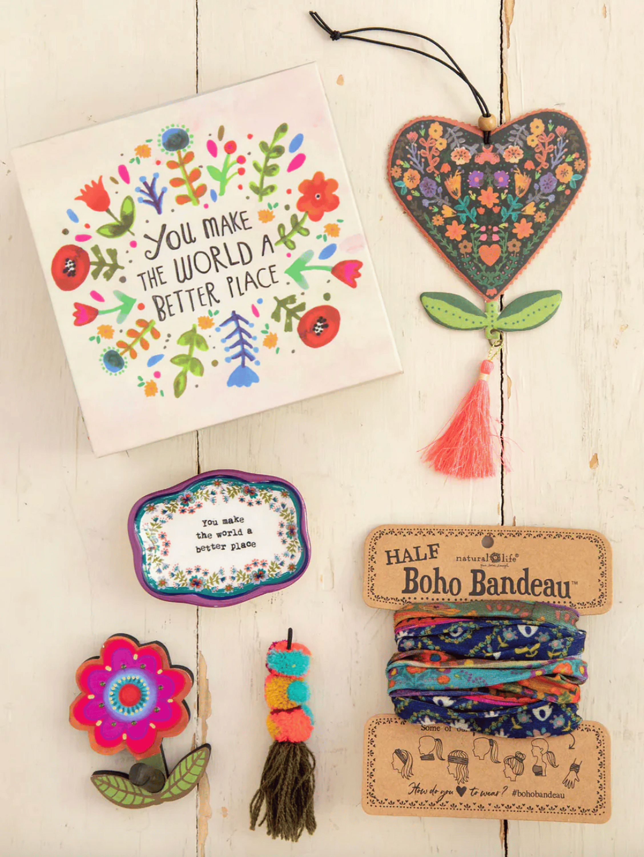 World Better Place Box Includes: Air Freshener, Artisan Trinket Dish, Tiny Tassel, Half Boho Bandeau®, Wooden Wall Hook & Sticker