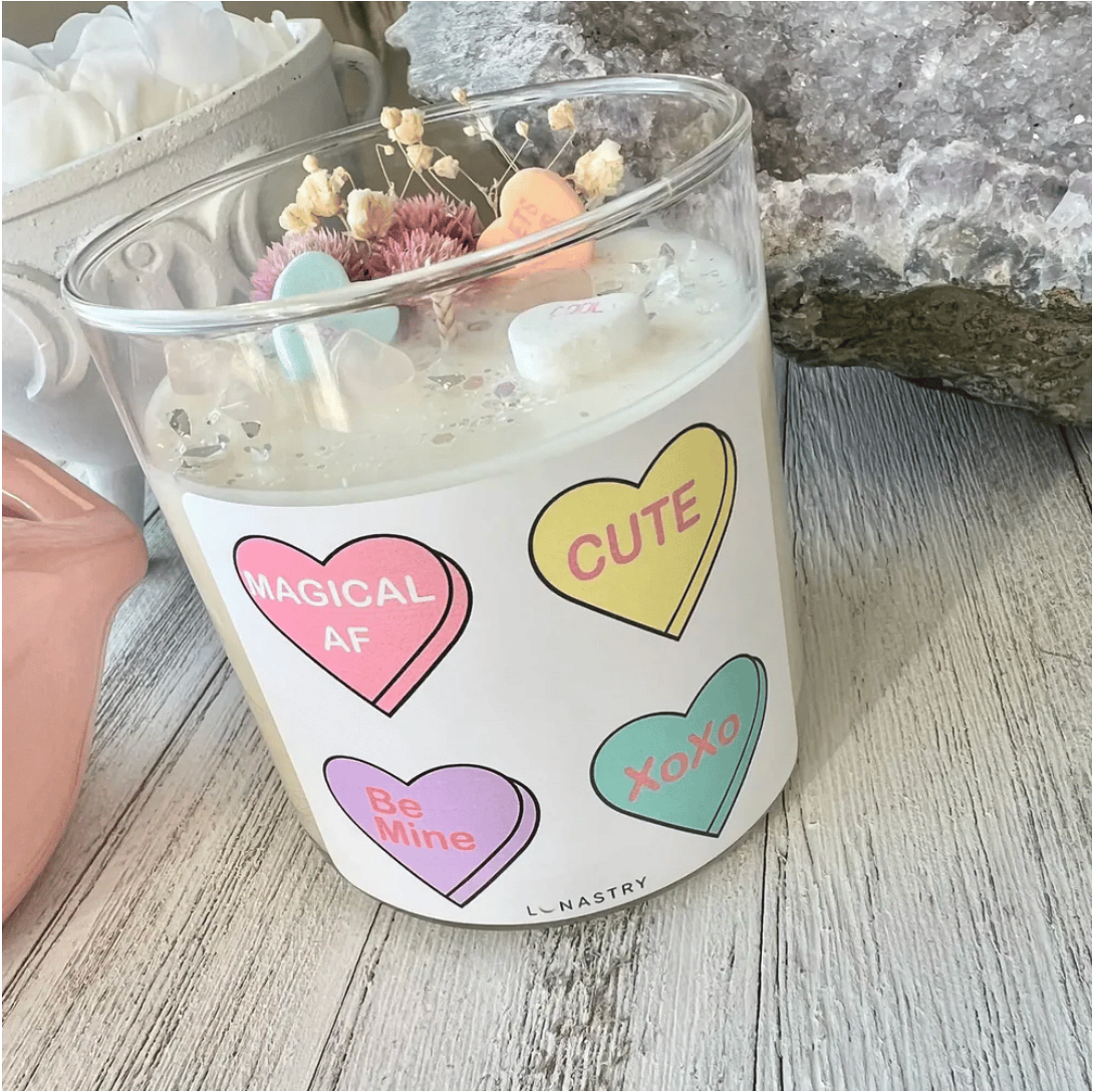 No better gift than some valentine cheer. Candle topped with real heart candy (not meant to consume). Flowers and glitter. embellishments may vary Scent will vary
