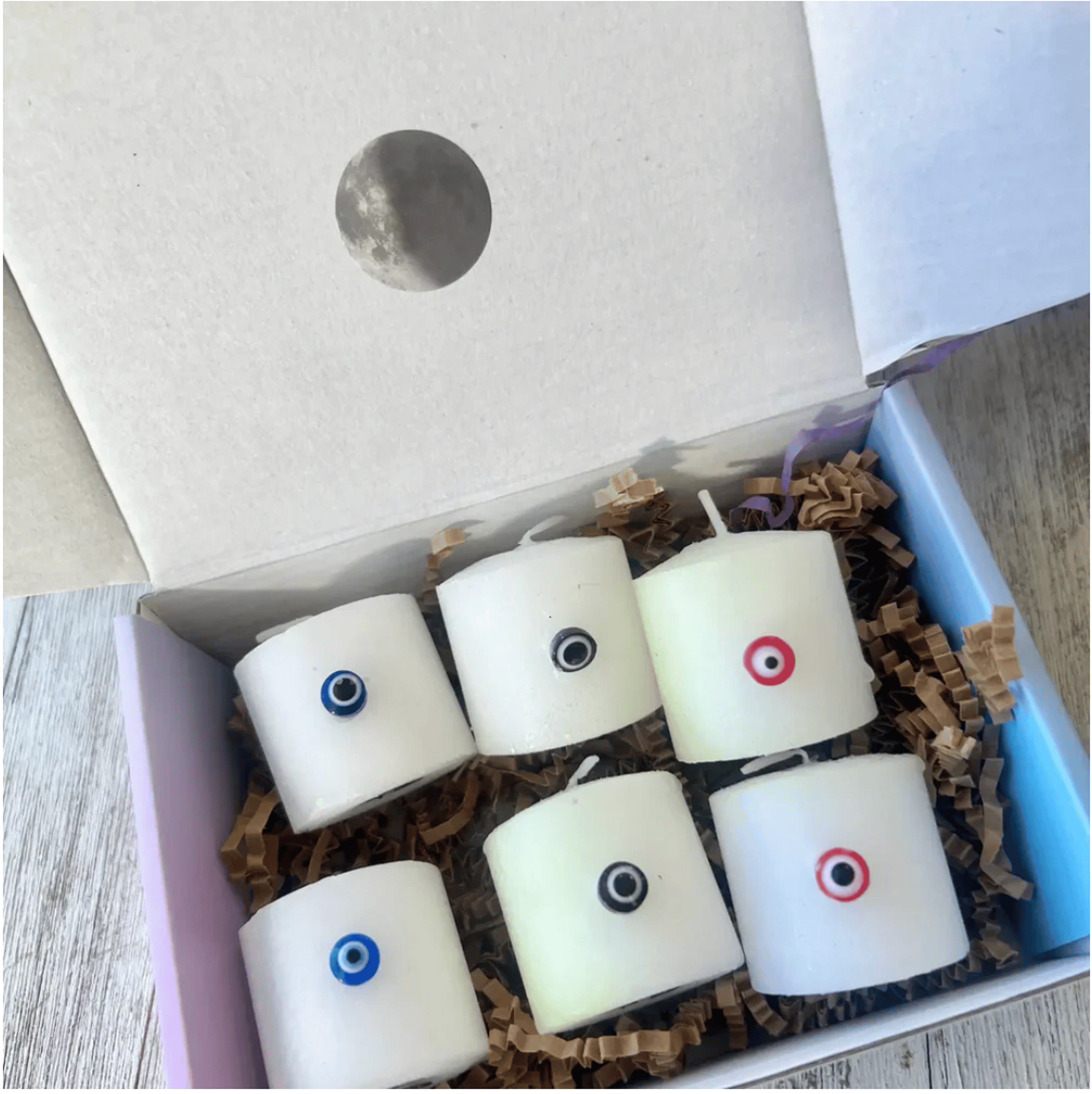 6 votive evil eye candles with small evil eye beads that can be used on a bracelet or necklace. 2 red, 2 black and 2 blue. Votive candles are topped with glitter and are unscented. ready to gift in a cute box. moon phase will vary. set intention into candle before lighting. votive candles require a fire proof plate to prevent burning and wax dripping.