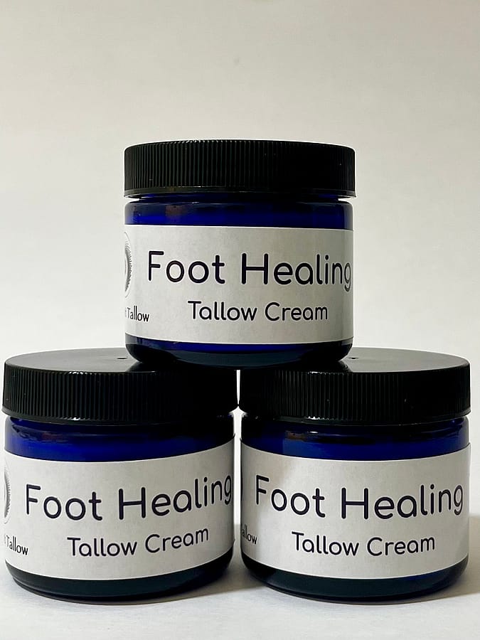 Foot healing was created to help tired, dry, even painful feet! Made with organic 100% grass fed beef tallow, organic cold pressed jojoba oil, organic juniper berry essential oil and organic arimose essential oil.