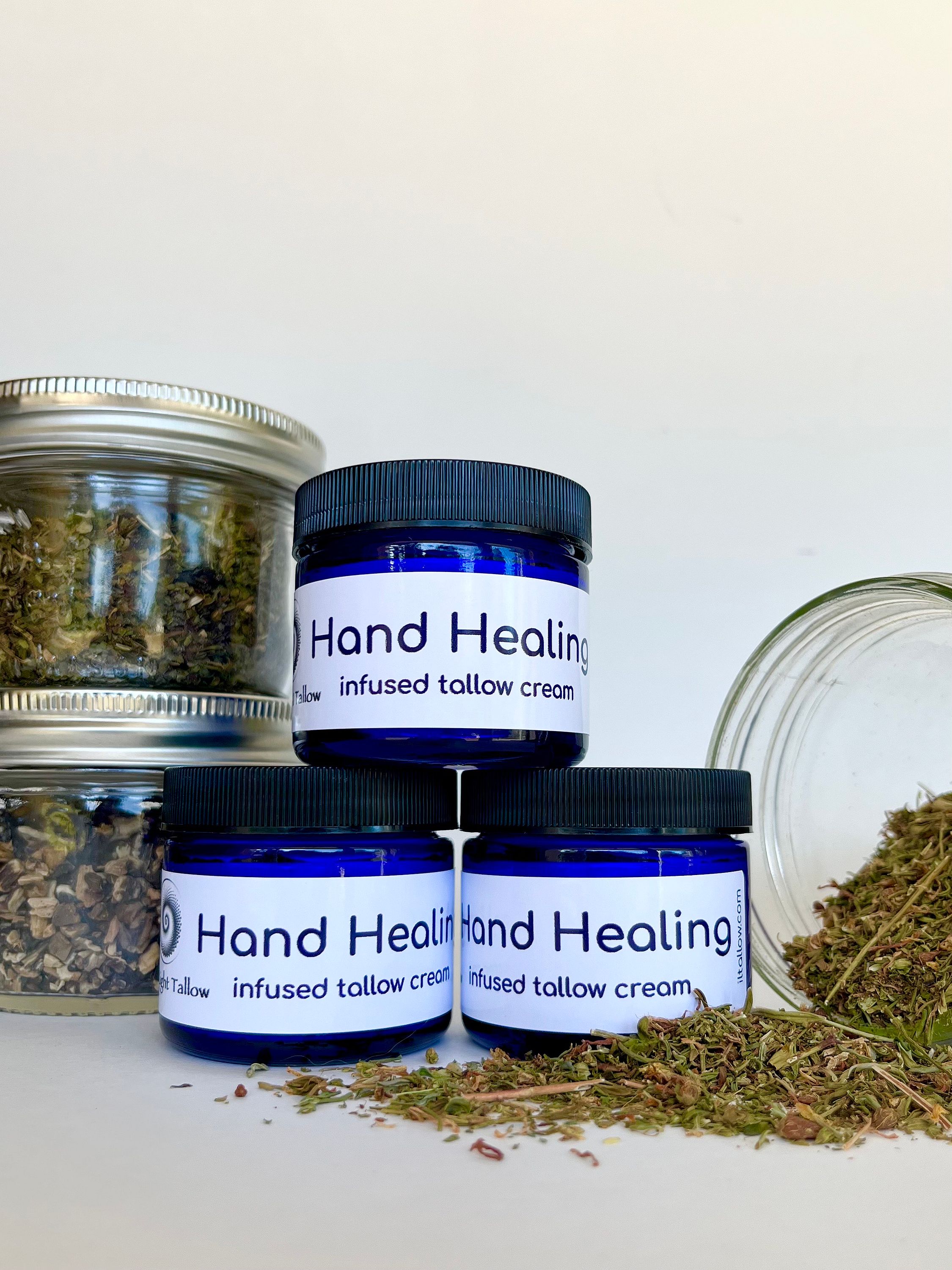 A holistic approach to life is more important than ever and 100% grass fed beef suet fat is used to render into our tallow. Tallow is eco friendly and utilizes parts of animals otherwise disregarded. Sourced from small Sonoma County ranches, I hand render the fat to then create this amazing hand cream. All InnerLight products are made with 75% tallow. There are no essential oils in hand healing