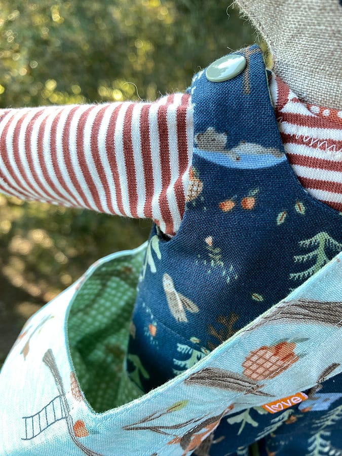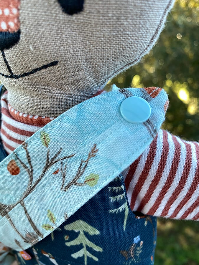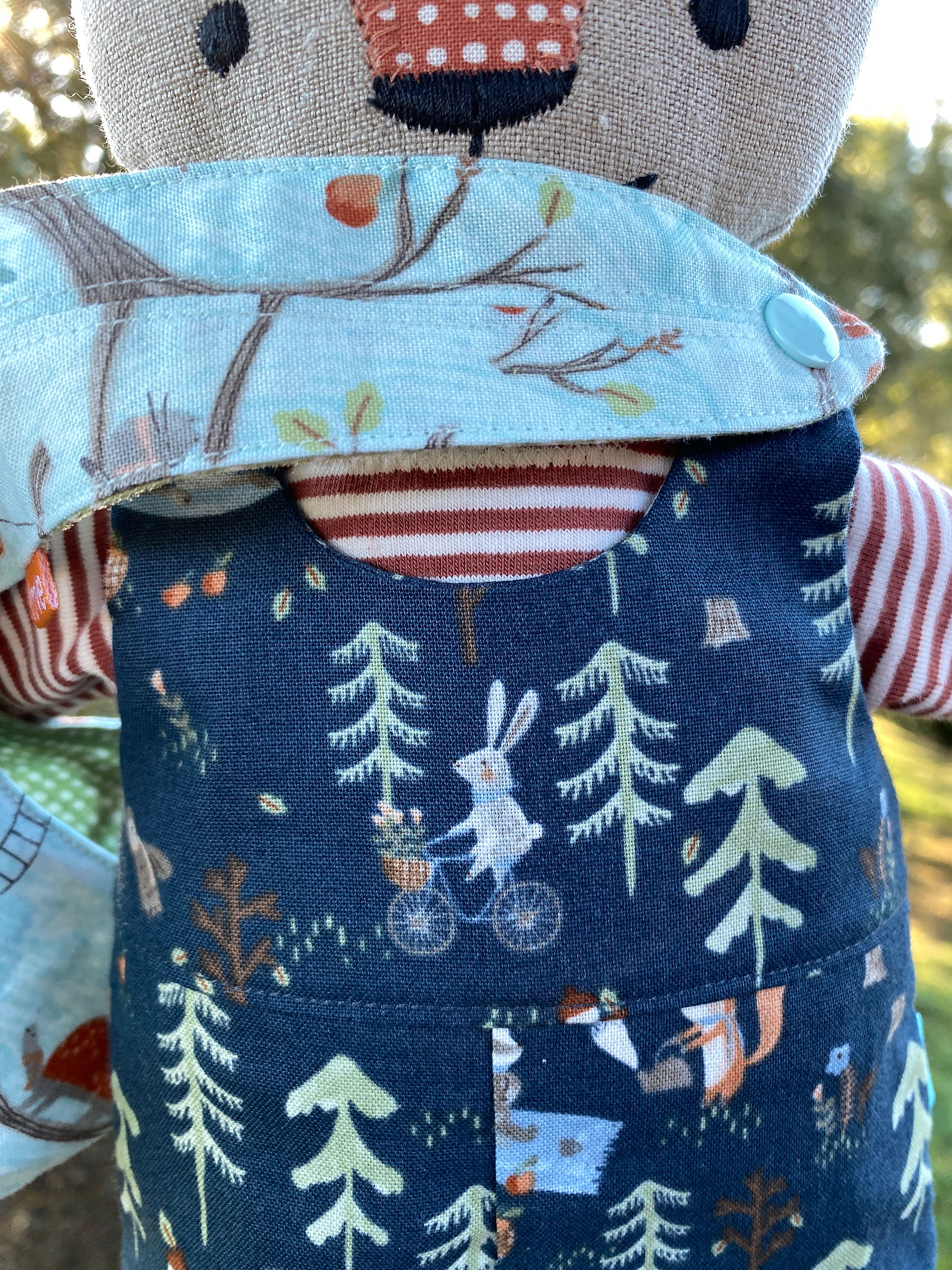 She’s dressed in beautifully sewn dungarees featuring a charming woodland print filled with tiny animals—look closely and you’ll spot trees, forest friends, and yes… little foxes on a fox! It’s a sweet, storybook detail that makes her outfit extra special. Underneath, she wears a cozy striped T-shirt and sweet little panties, making her outfit feel thoughtfully complete.