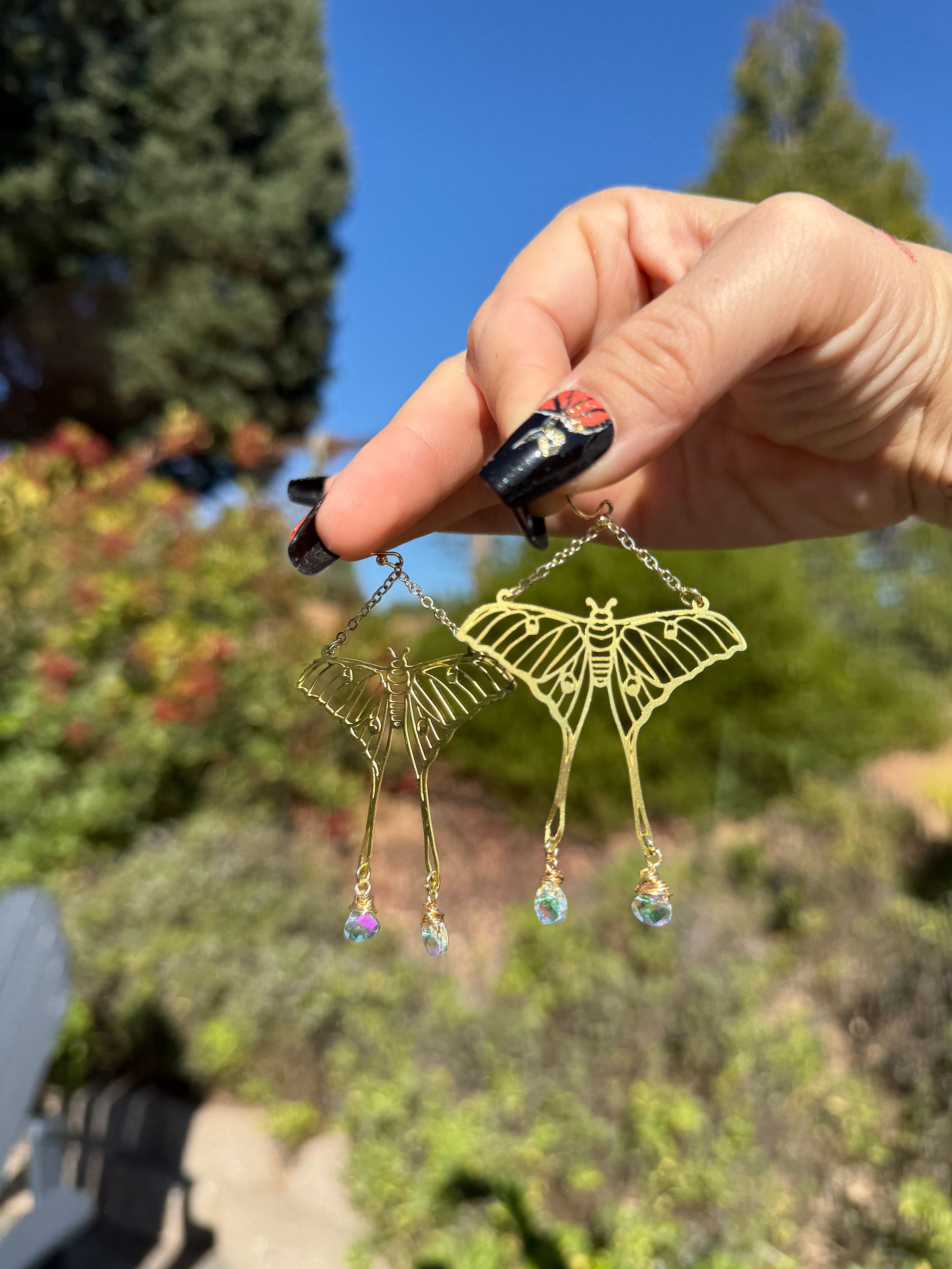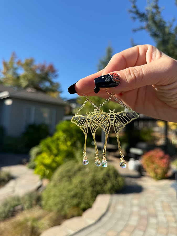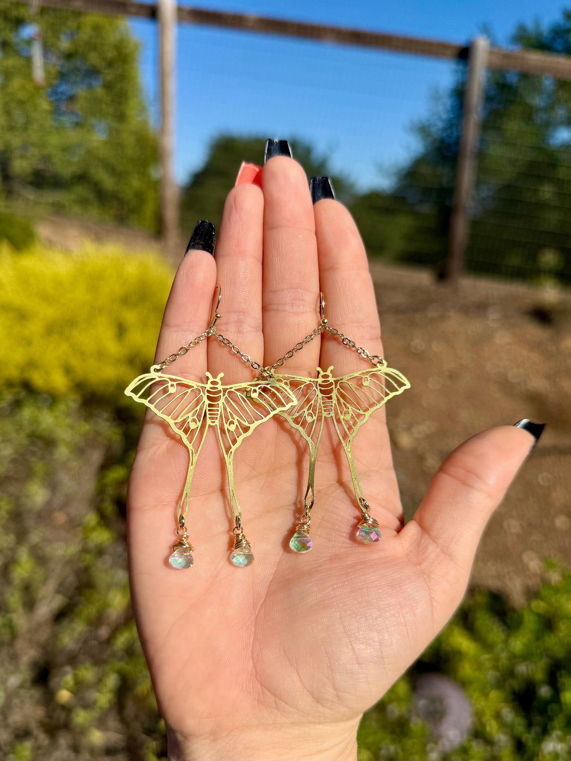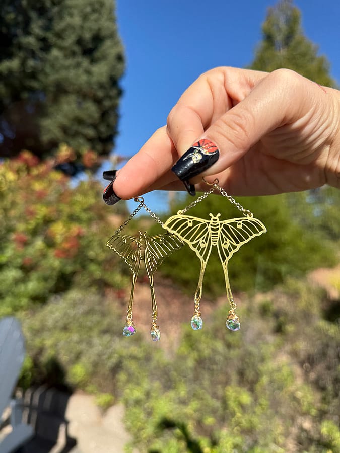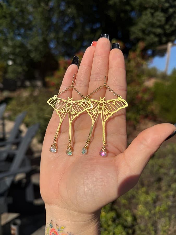 ✨Handmade Large Gold Luna Moth Sparkle Earrings Made with Gold plated ear wire, and brass moth charms, paired with clear AB rainbow glass drop beads. All materials are leads and nickel free!✨