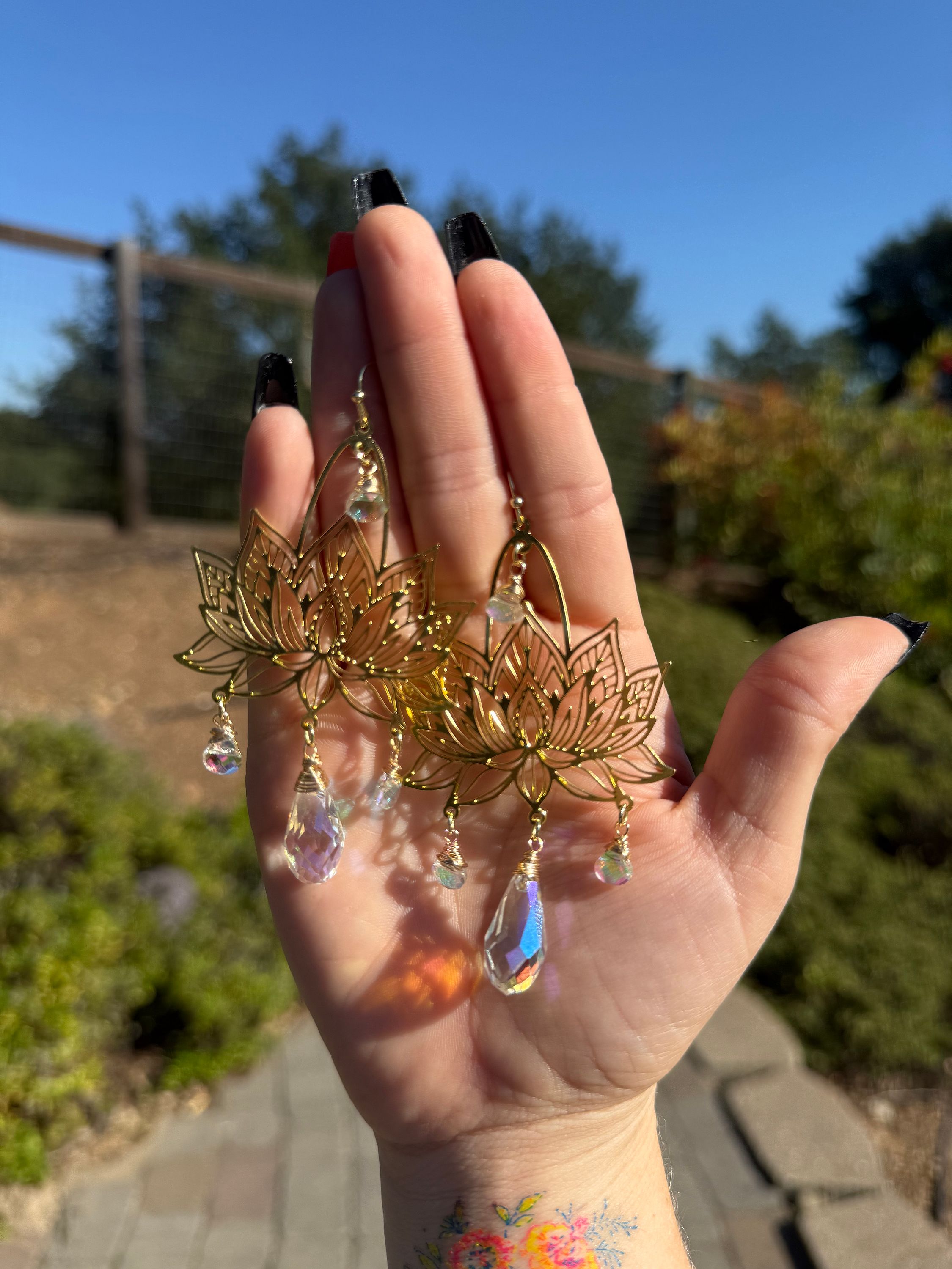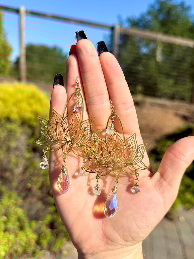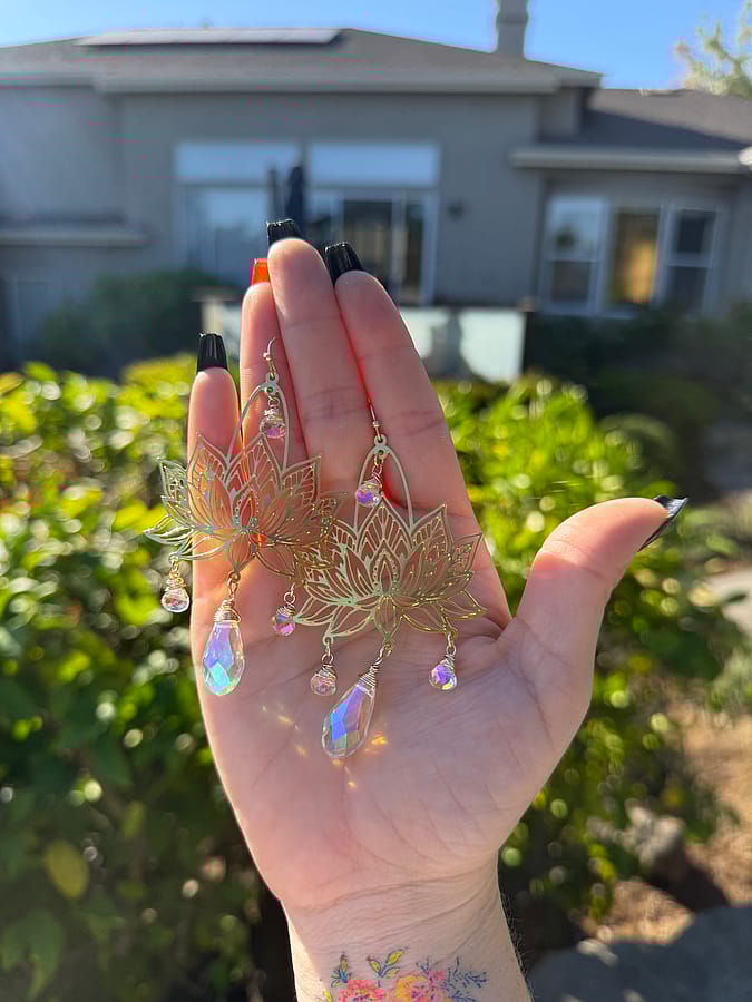 ✨Handmade Extra Large Chandelier Lotus Sparkle Dangle Earrings, available in gold or silver. Made with Gold plated ear wire or silver, and brass charms OR stainless steel charms, paired with clear AB rainbow glass drop beads. All materials are leads and nickel free!✨