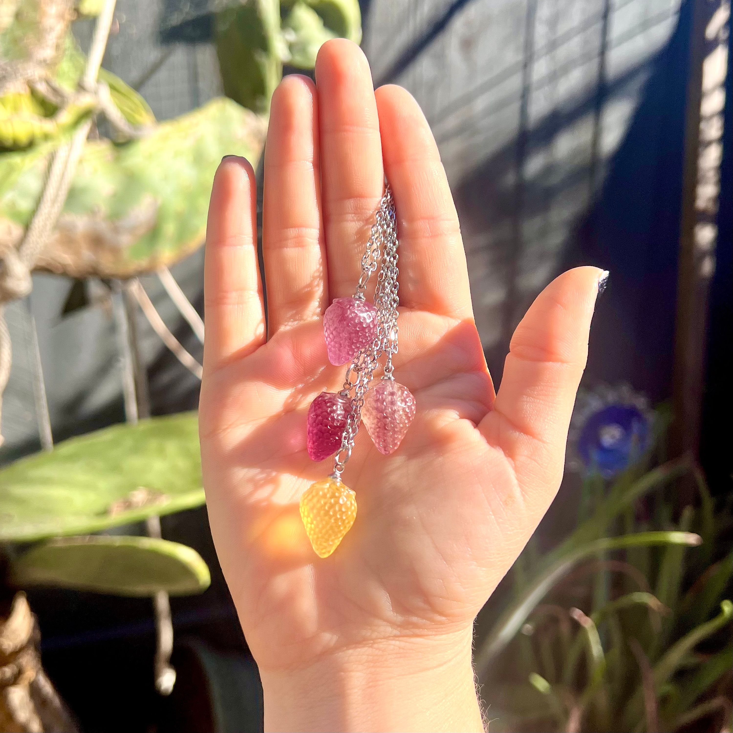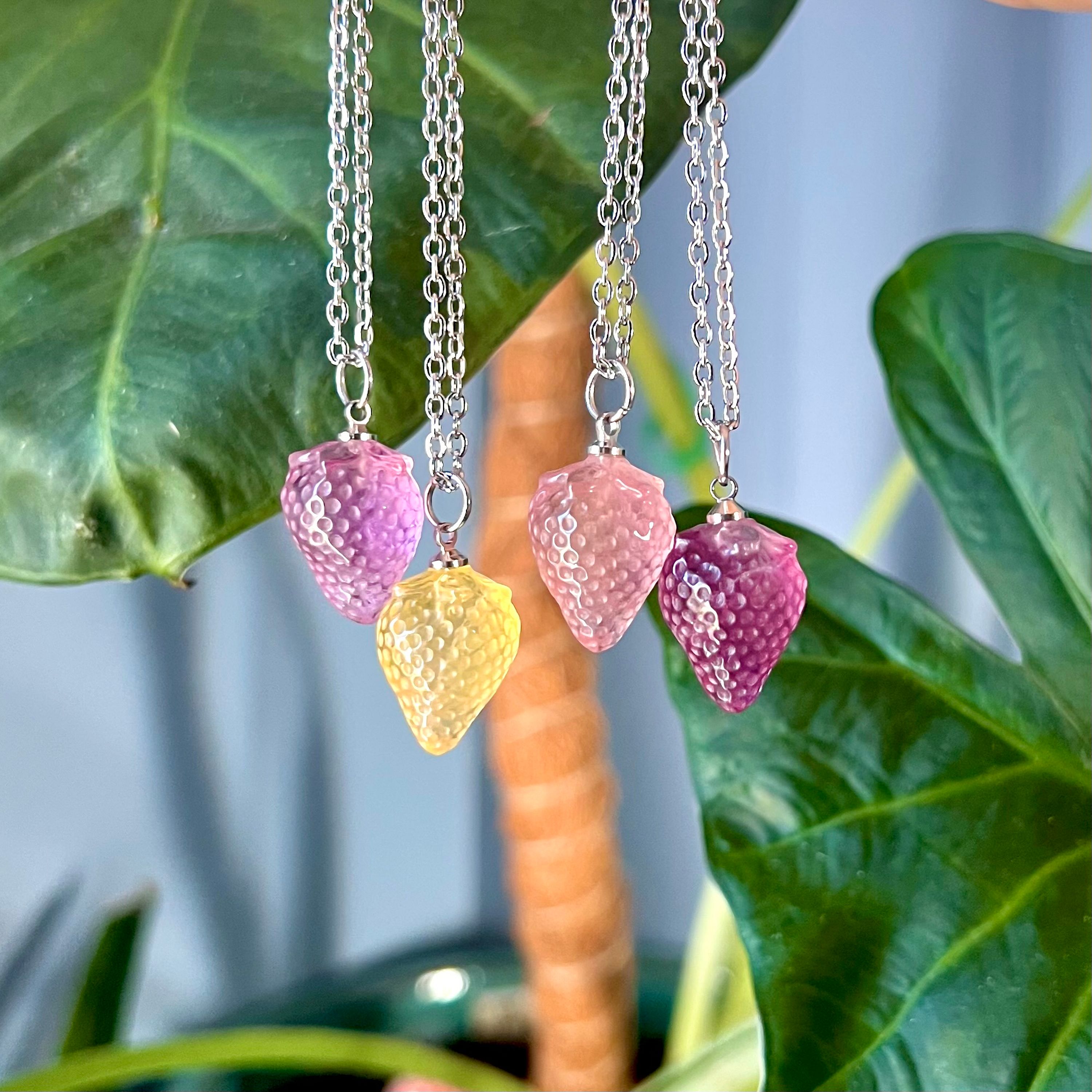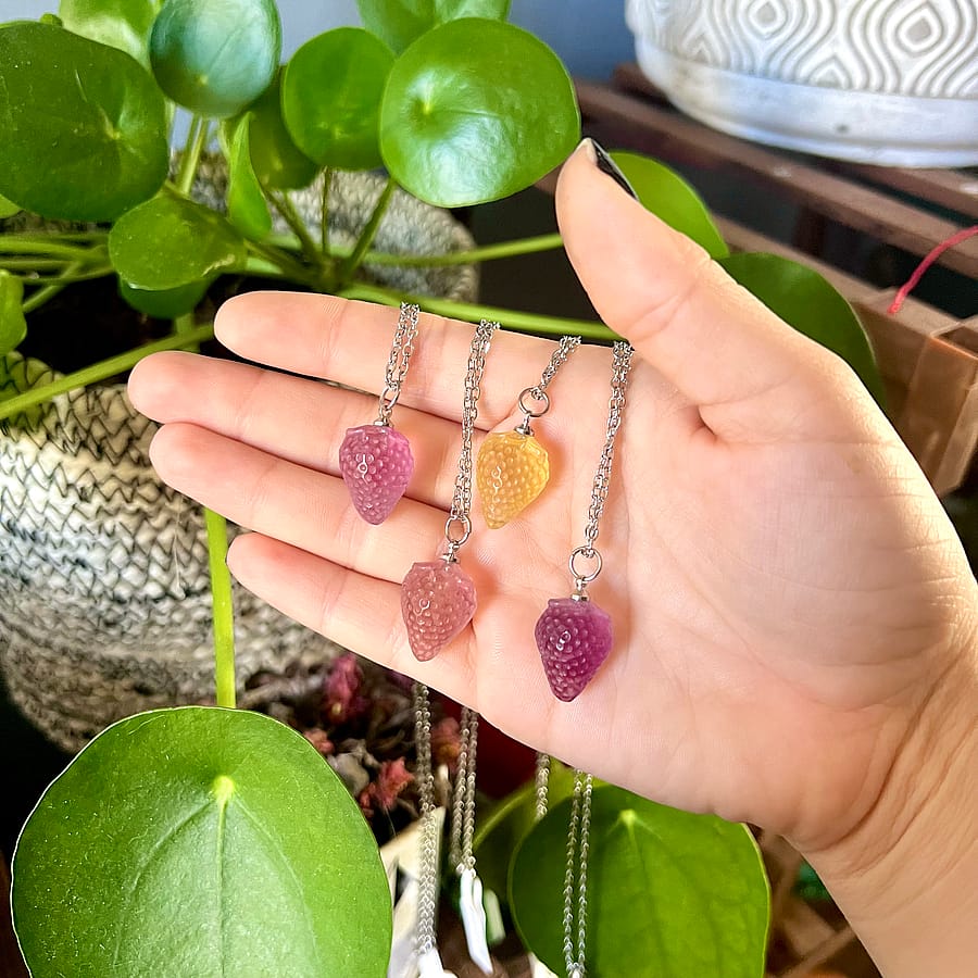 This handcrafted necklace features a natural fluorite crystal pendant, carved into a tiny strawberry, on a delicate yet sturdy 18" tarnish free Stainless Steel chain, and closes with a silver lobster clasp. All metal is lead and nickel free!