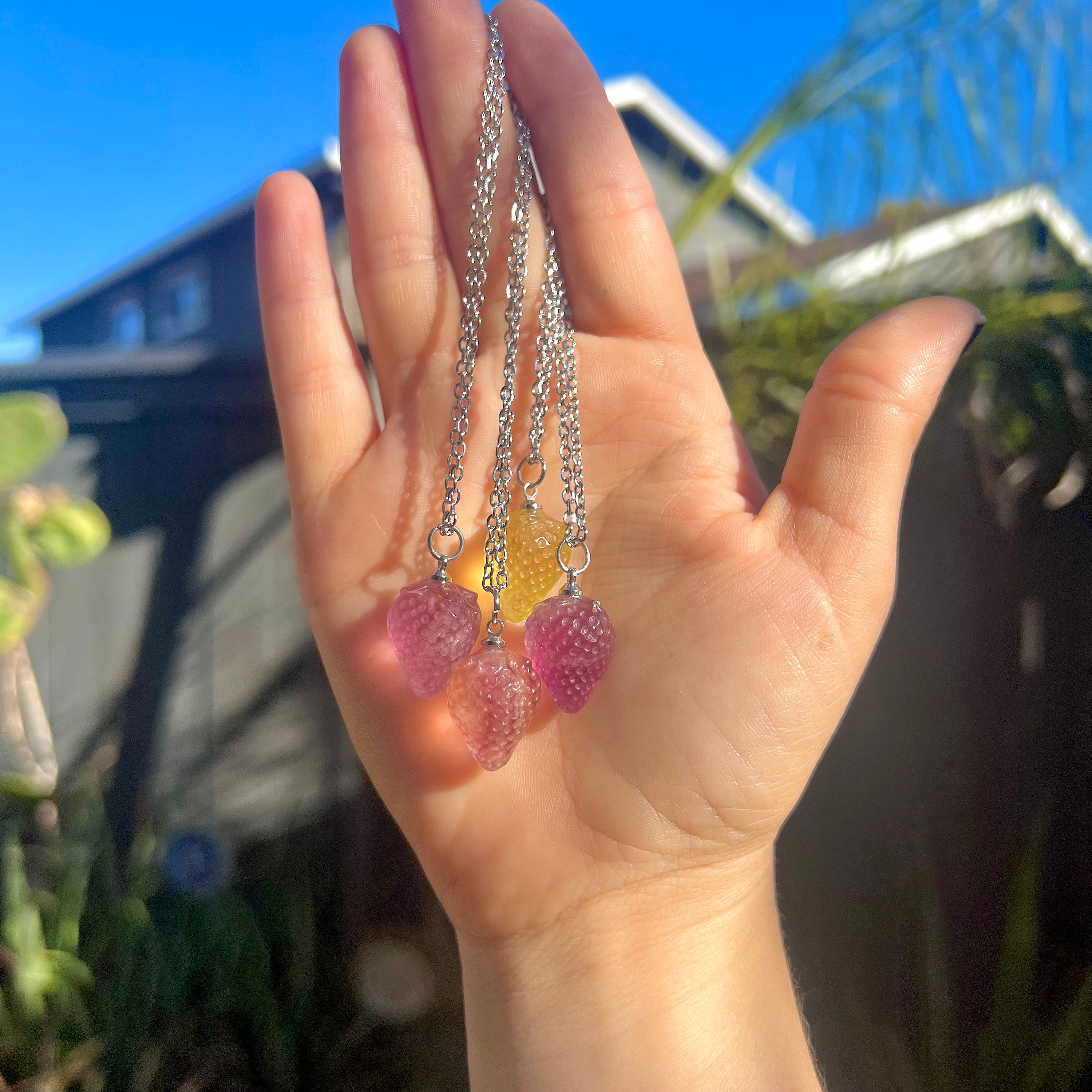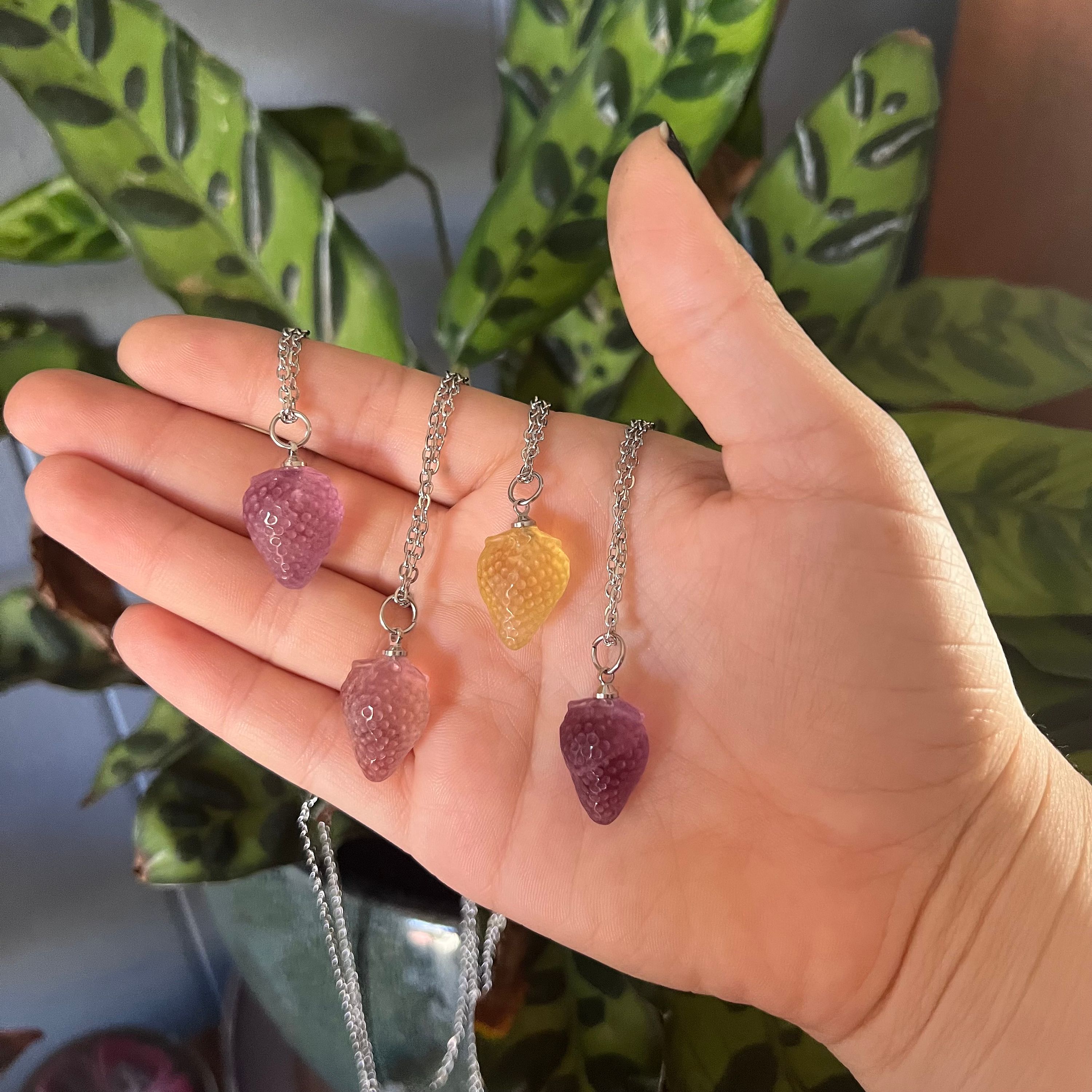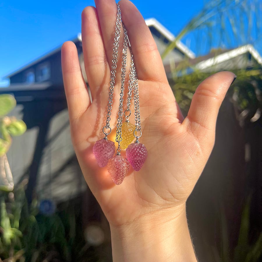This handcrafted necklace features a natural fluorite crystal pendant, carved into a tiny strawberry, on a delicate yet sturdy 18" tarnish free Stainless Steel chain, and closes with a silver lobster clasp. All metal is lead and nickel free!