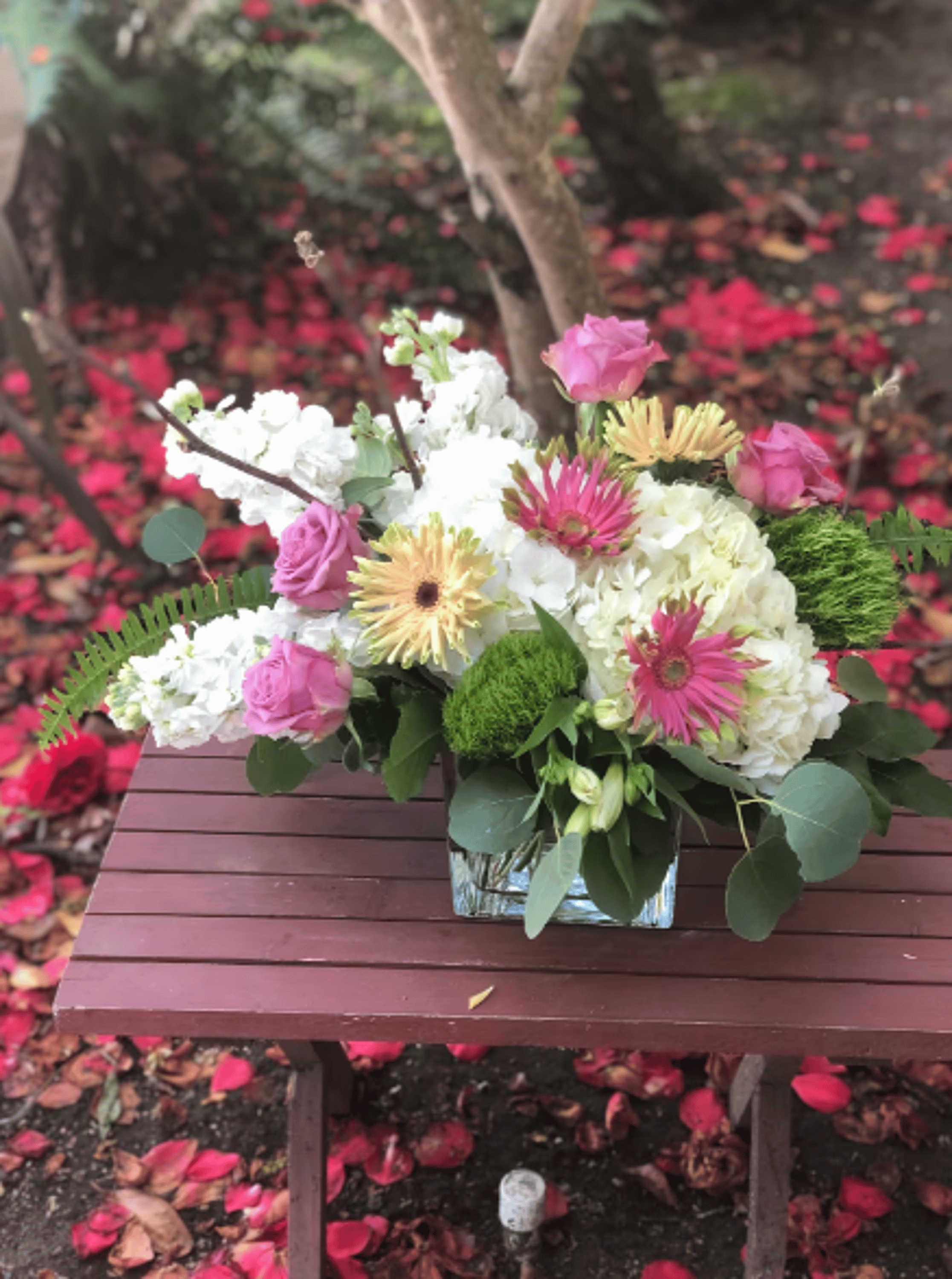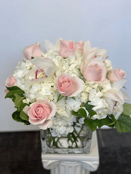 Includes white roses, blush pink roses, and white hydrangea all in a beautiful high quality vase. APPROXIMATE DIMENSIONS:10" H X 11" W X 11"L
