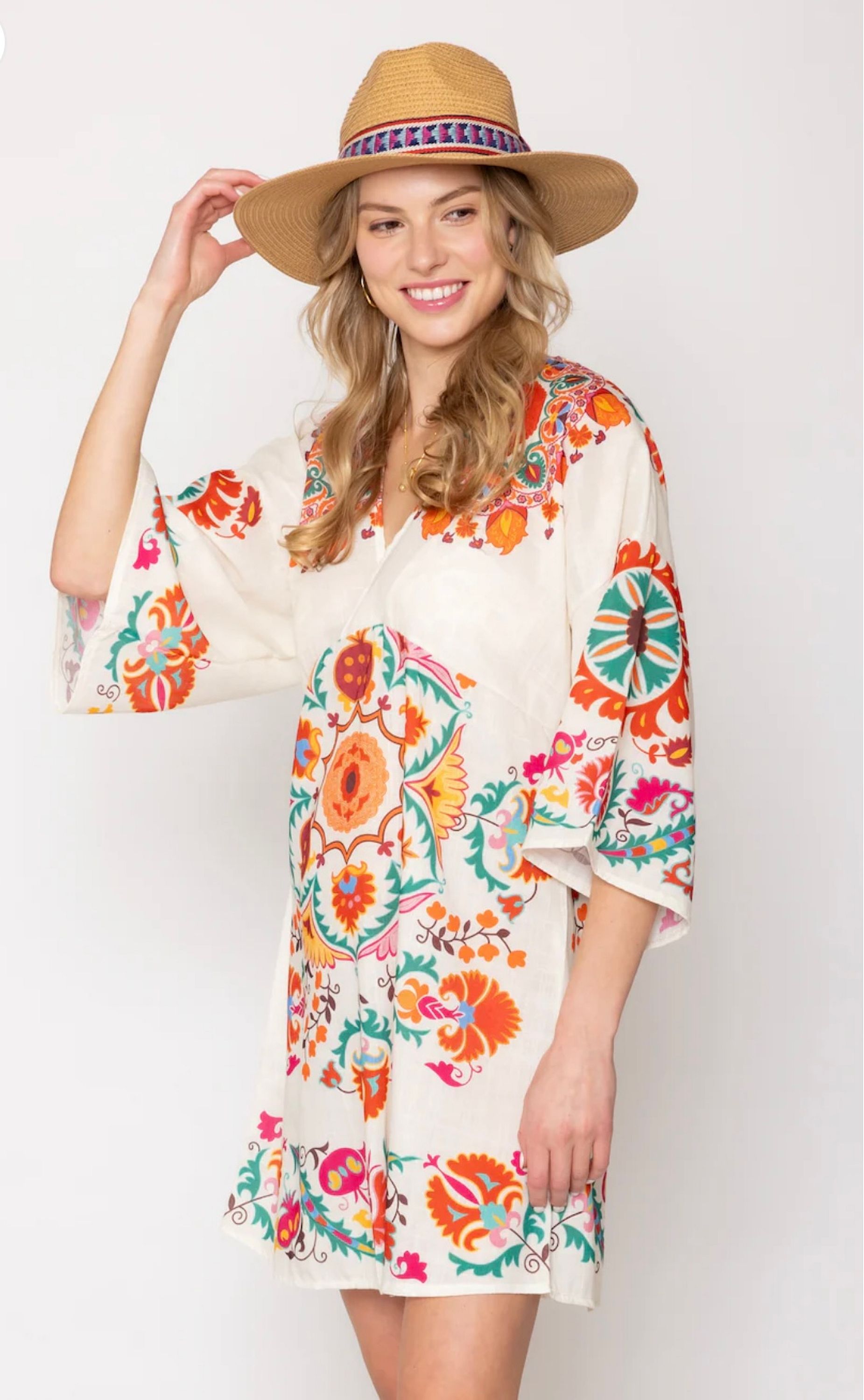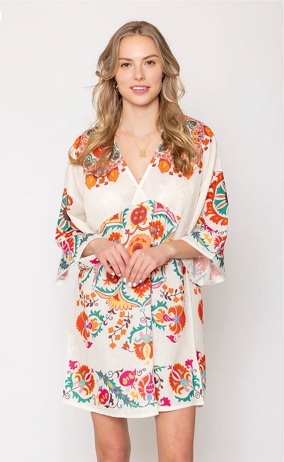 This boho chic dress can be worn as a beach or pool cover-up or a cool dress with sandals. This versatile piece can be paired with a bathing suit or a pair of jeans.