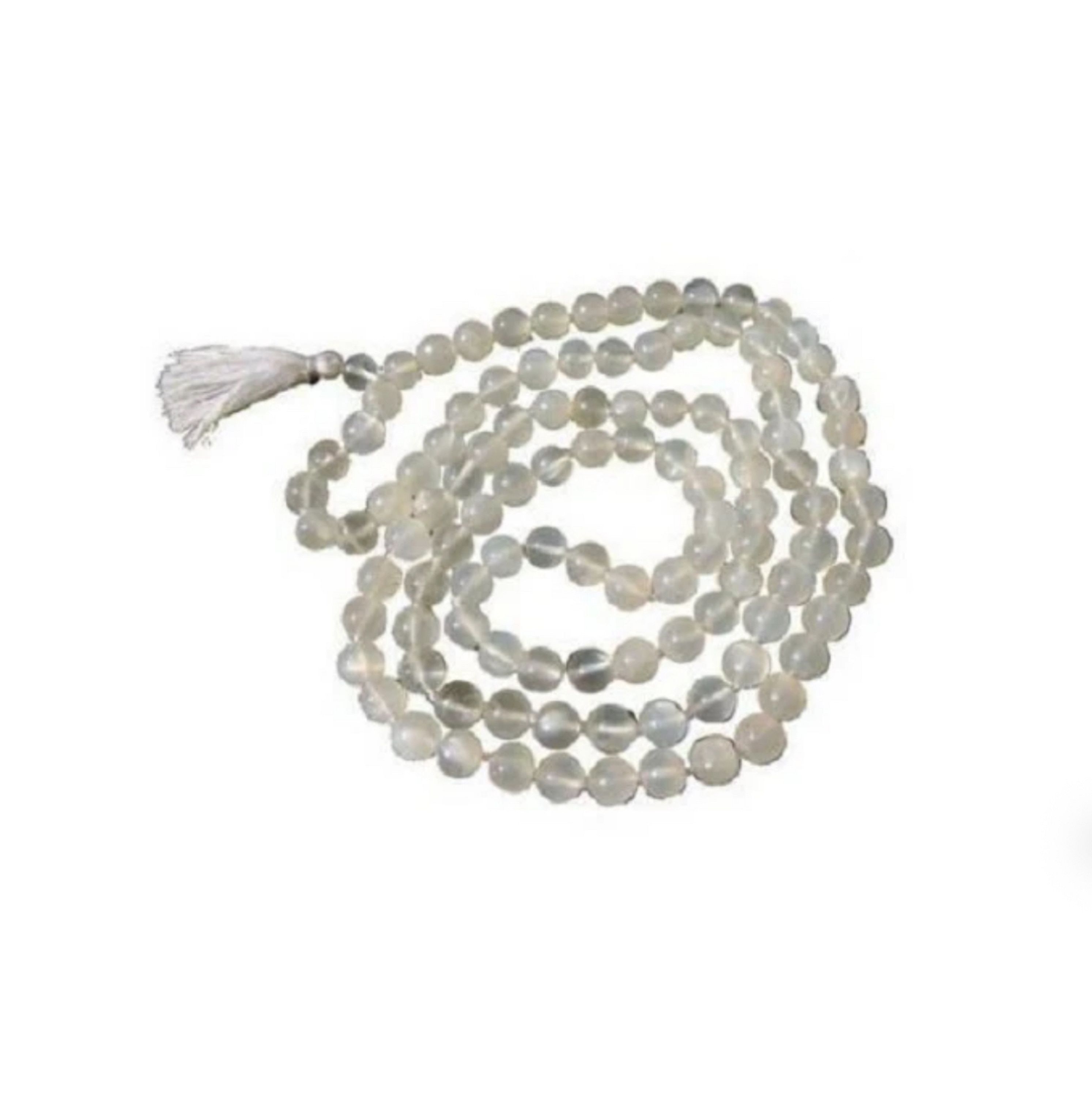 This mala, made from the gem moonstone, carries a peaceful air as the light plays with the white marbled beads.