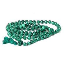 There is something very special about this mala as its unusual beads captivate the eyes while the mantra to the Divine Mother gives it a unique spiritual energy. The 108 round beads are carved and polished malachite, a marbled green, crystalized mineral that has the feel of stone. Malachite is a copper carbonate hydroxide mineral, from which the beads of the mala are made. These beads are man-made. The corresponding mantra, as well as the significance of the mala, are provided on an attractive insert.