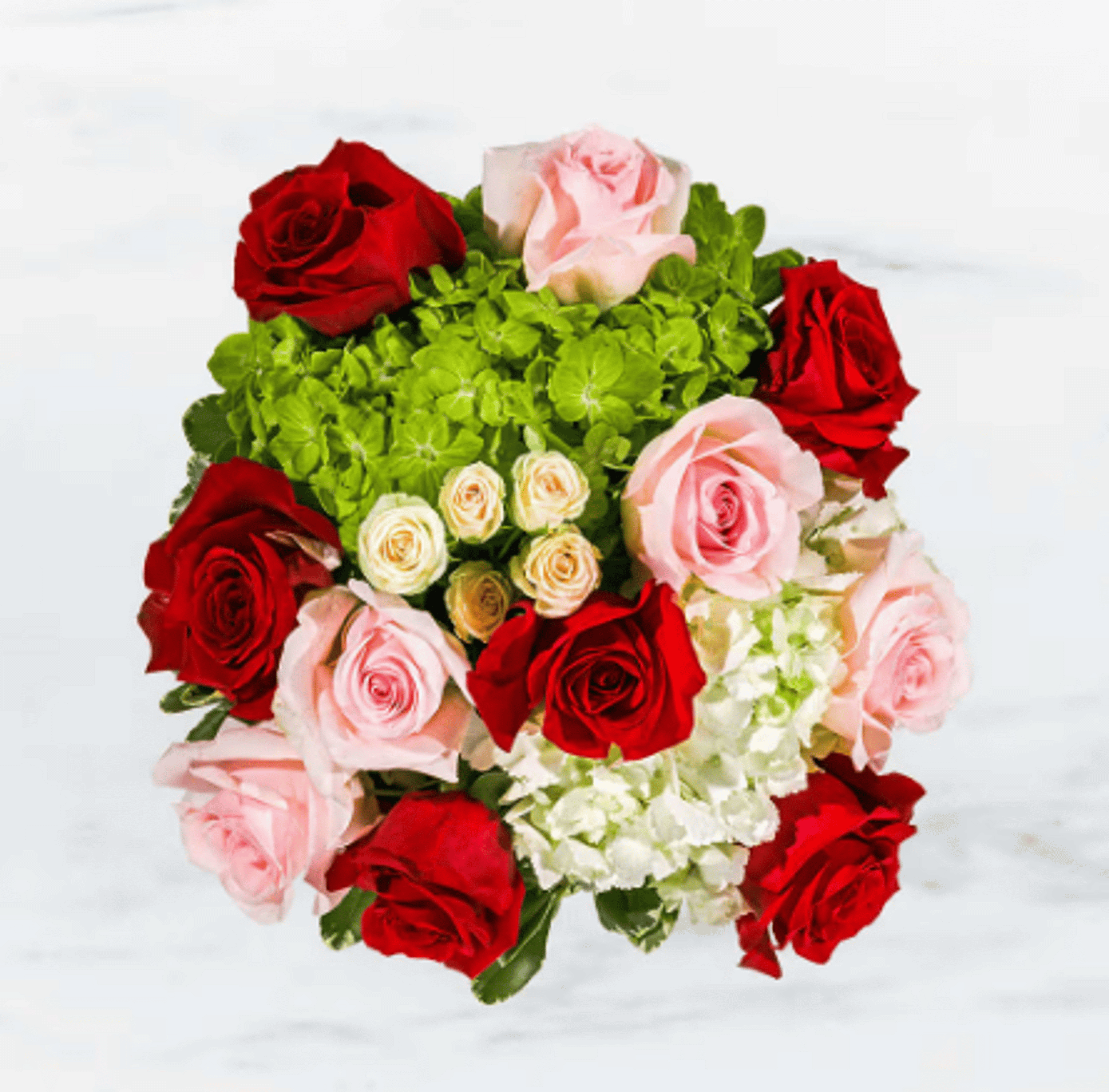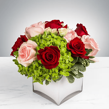 This arrangement includes blush pink roses, red roses, blush spray roses, white hydrangea. Young Love is the perfect gift to wish someone a happy birthday or to say thank you. APPROXIMATE DIMENSIONS:10" H X 11" W X 11"L
