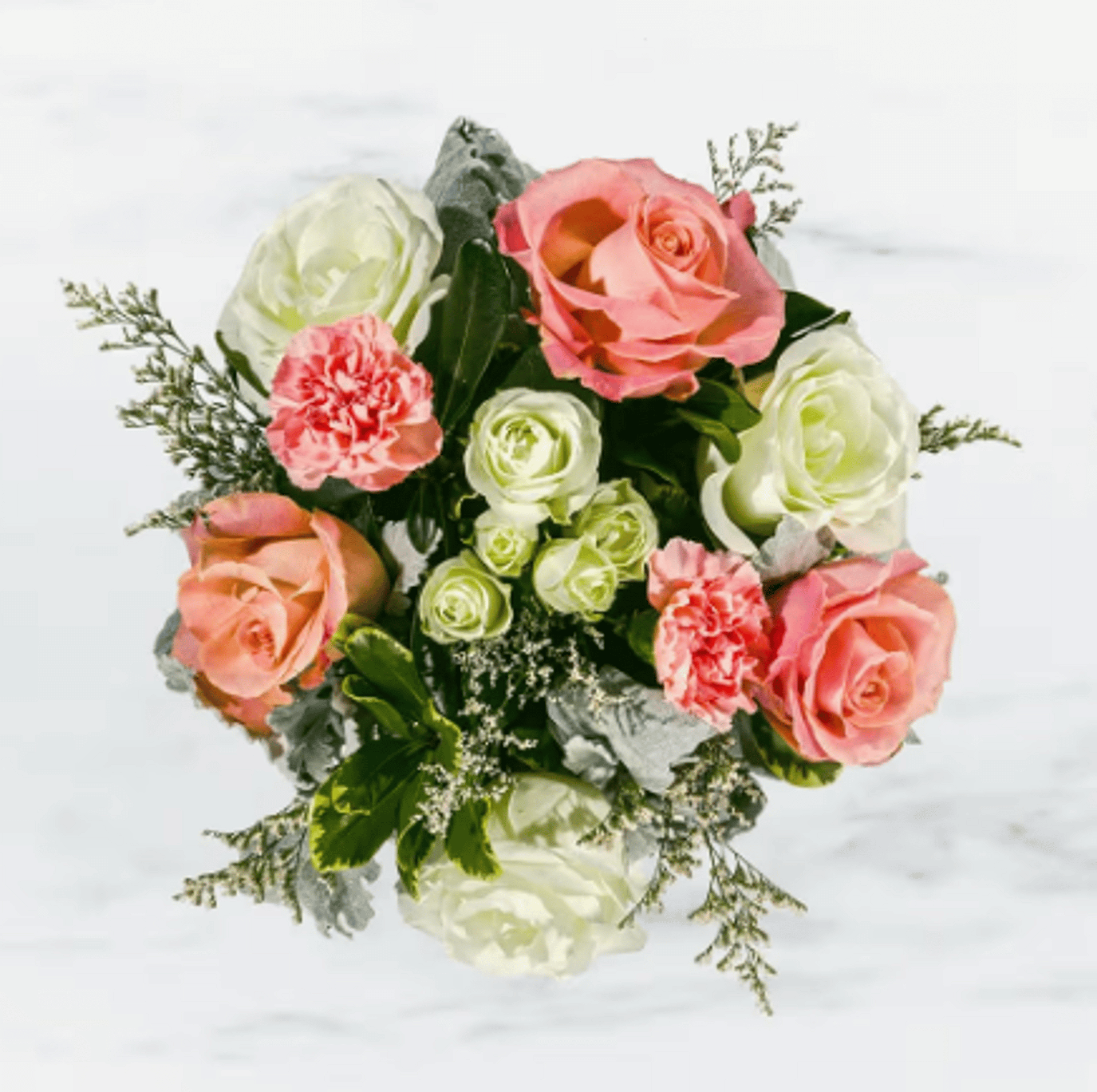 This arrangement includes pink roses, white roses, white spray roses, pink carnations, and dusty miller. Sweet & Subtle is the perfect gift for a birthday, thank you, or just because. APPROXIMATE DIMENSIONS: 9" H X 10" W