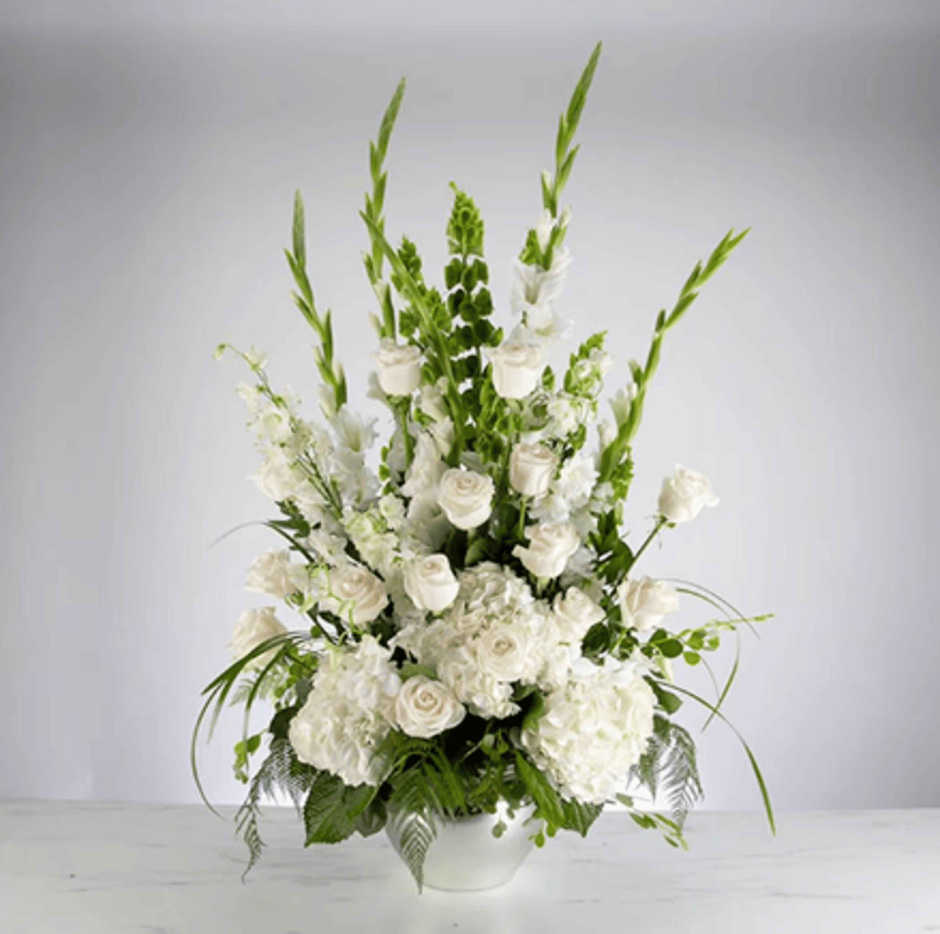 An all white tribute, this funeral piece is pure and tranquil. Featuring a variety of white flowers and greenery, this design reaches for the sky and evokes a feeling of peace upward and outward. Our design is created in a large clear vase which prolongs the life of the flowers. We prefer to create in a glass vase for longevity (unless grave side- burial)
