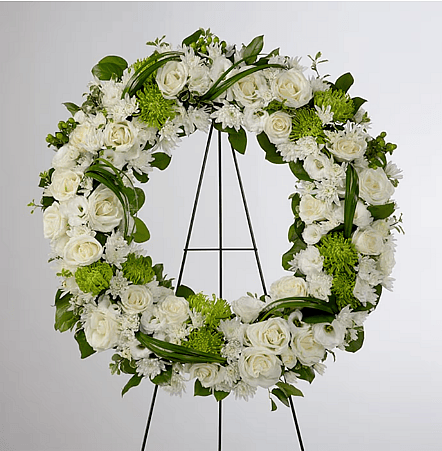 A beautiful white and green tribute wreath that calms, this easel arrangement celebrates a full life and a peaceful passing. Standard- 18 inch Deluxe- 20 inch Premium- 22 inch