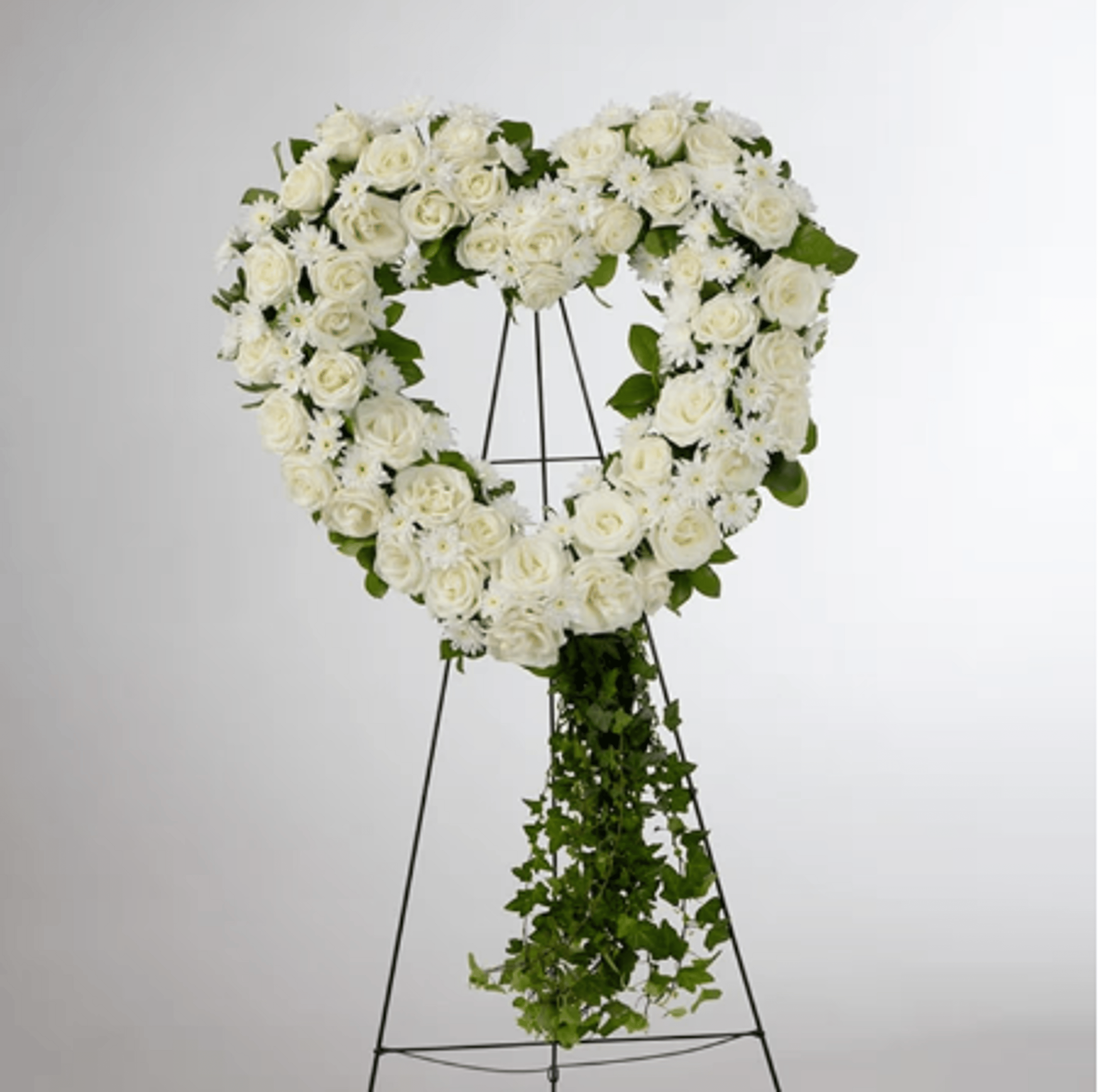 An all white tribute, this heart shaped easel shows your everlasting love. Featuring a variety of white flowers and greenery, this heart with a trail of ivy compliments the beauty of life.