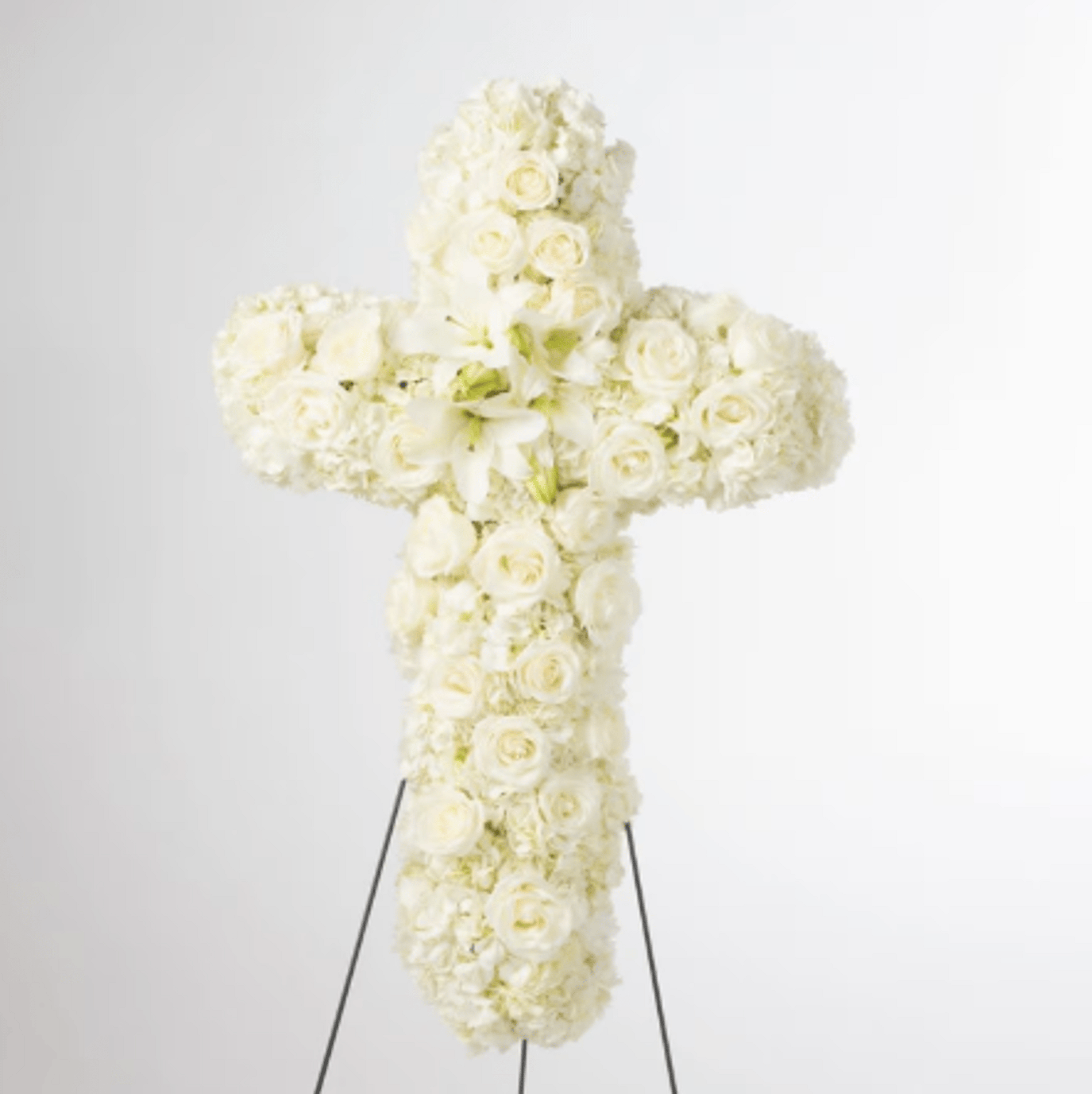 An all white tribute, this white cross funeral spray is pure and tranquil. Featuring a variety of white flowers, this elegant easel compliments the beauty of life. Standard- 24 inch Deluxe- 30 inch Premium- 36 inch
