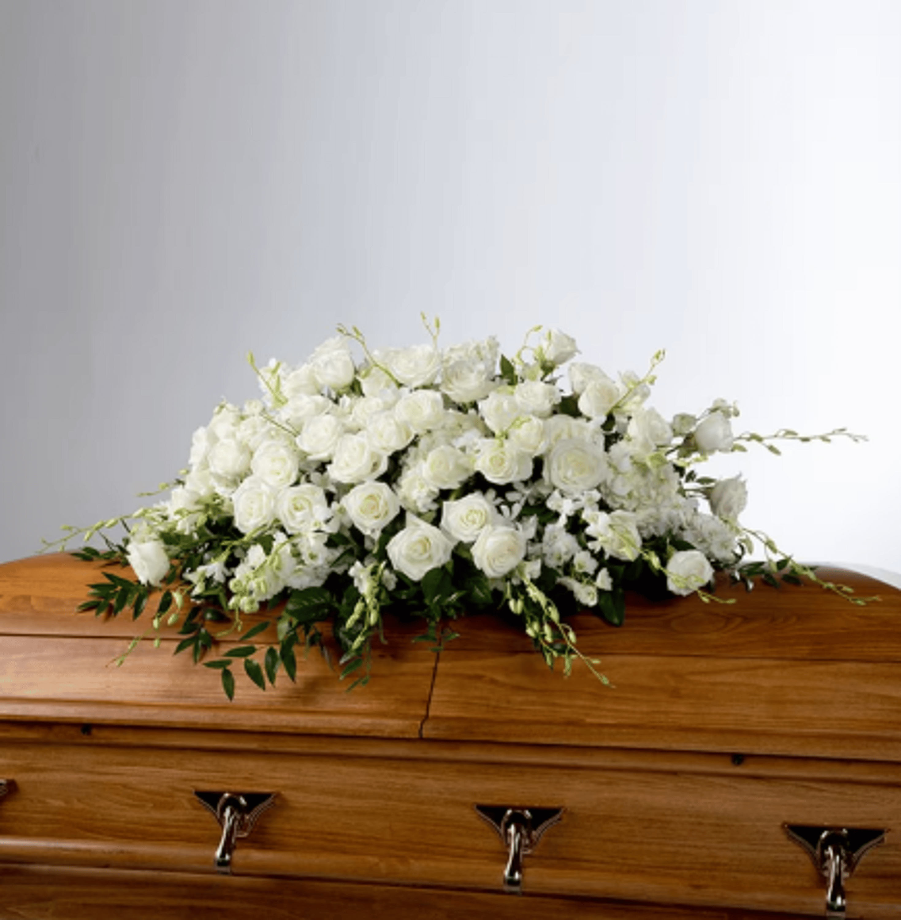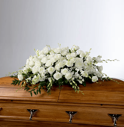 An all white tribute, this full casket spray is pure and tranquil. Featuring a variety of white flowers and greenery, this elegant spray evokes a feeling of peace.
