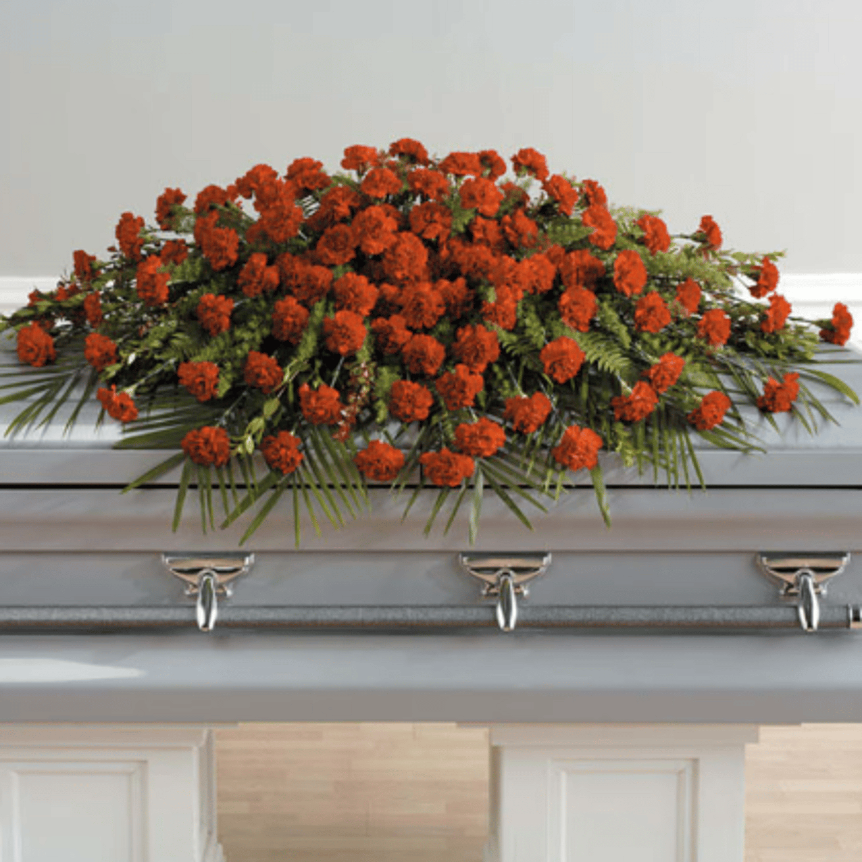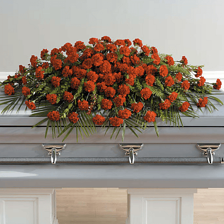 A full casket spray of robust, red carnations makes an impressive display for that someone special.