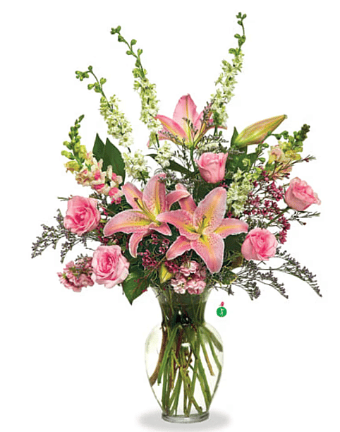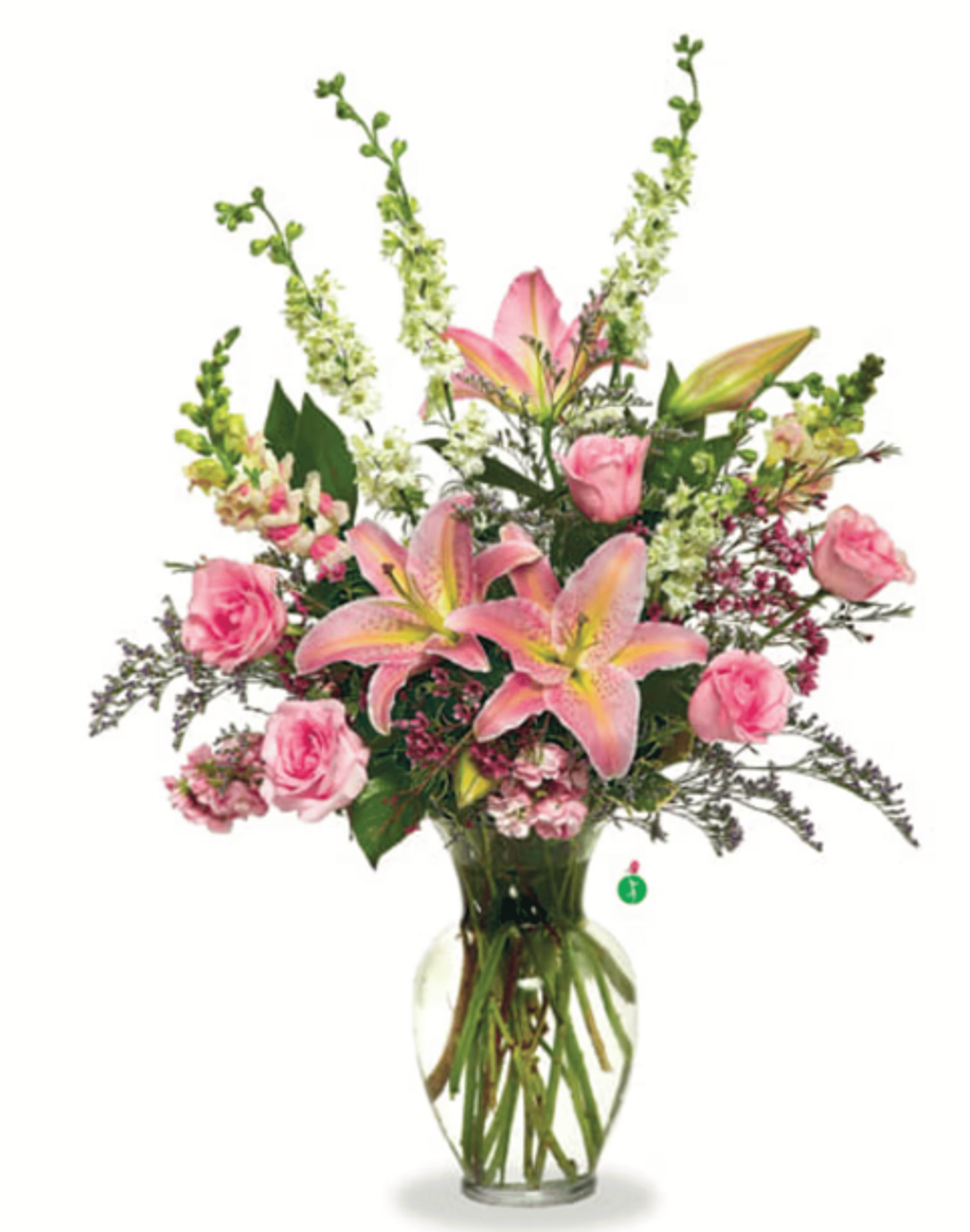 A fun, festive mix of pretty pink blossoms – including fancy fresh flowers such as roses, lilies and stock, in complementary blushing tones – creates a magnificent display that’s a lovely gesture for a birthday, anniversary or other special day.