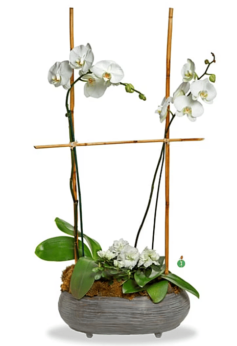 What’s better than one white phalaenopsis orchid? Two of these beautiful orchid plants, nestled side by side in a pot, along with a blooming white azalea plant. An elegant presentation, and an appropriate gift for any occasion. Dressed up in a nice ceramic pot or basket.