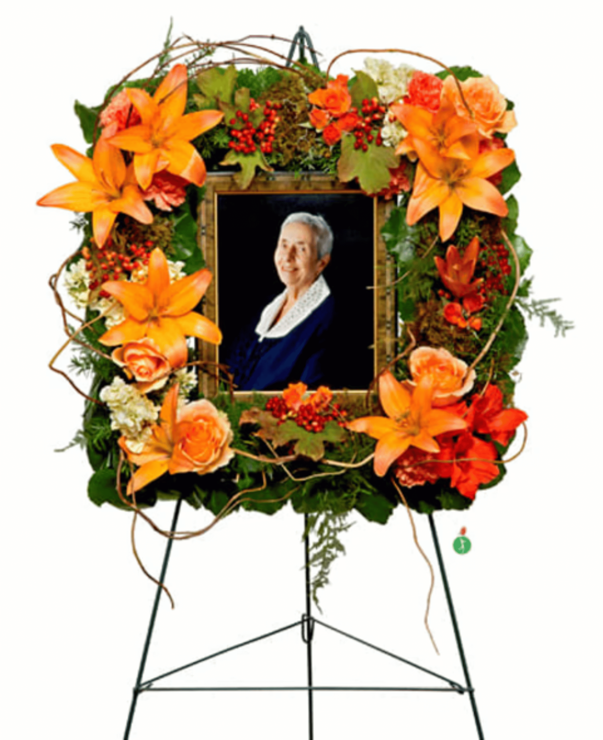 Display a sentimental portrait in this standing spray frame created with a mix of orange blooms, berries and green leaves, and give a loving tribute to memories that will last forever. Does not include picture frame shown.