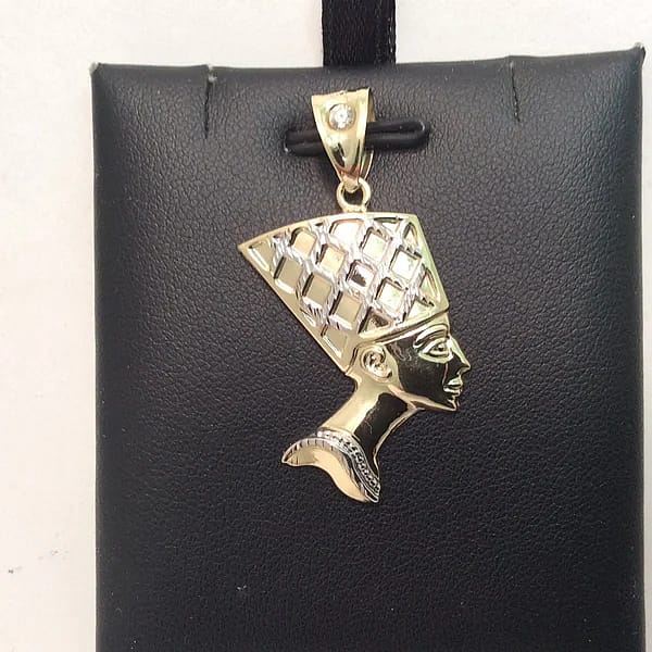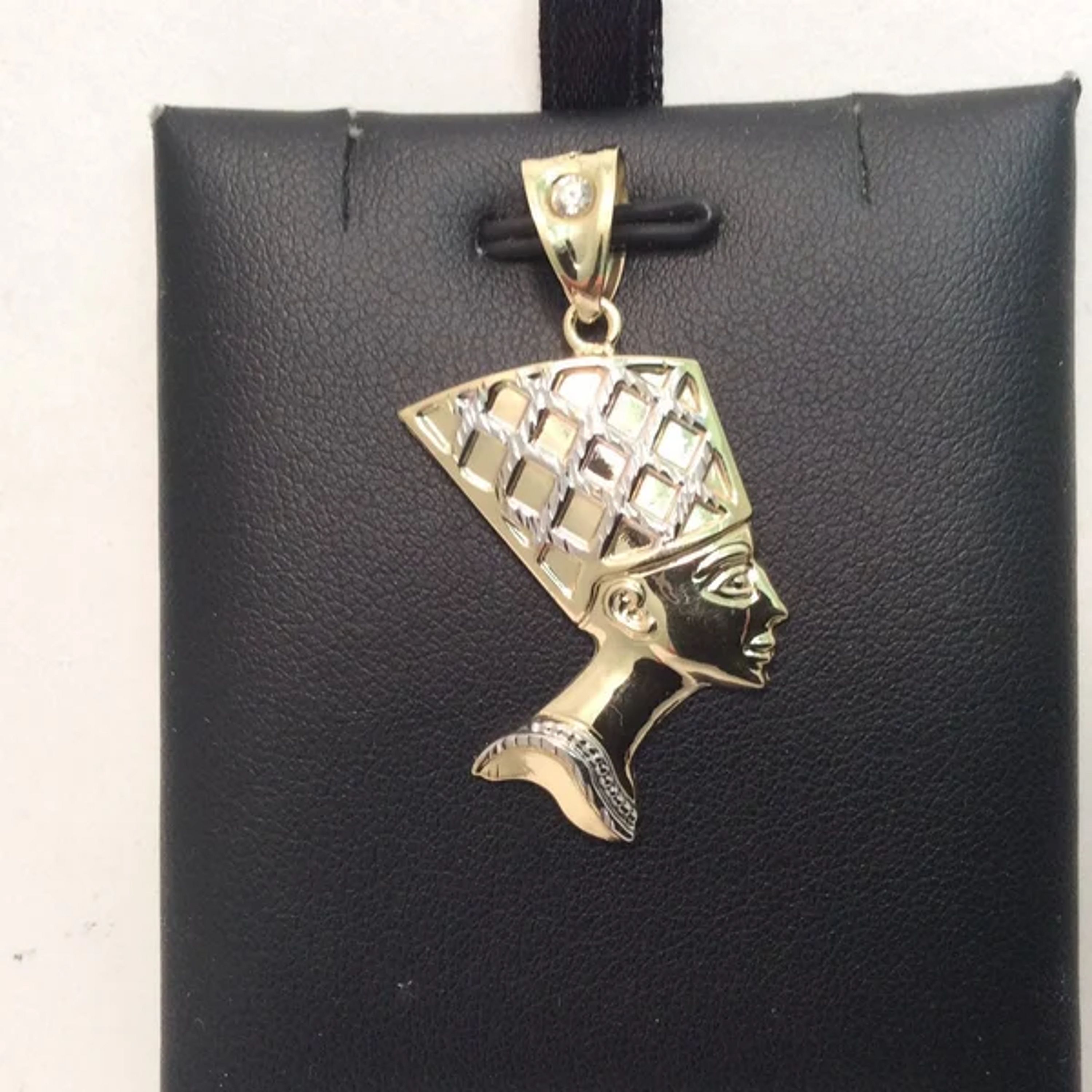 10K Yellow real Gold Nefertiti Head 2 Tone CZ Pendant Egyptian Queen Charm 2.50 grams Metal Type: 10K Yellow Real 2 tone Gold Weight: 2.50 Grams Width: 1 Inch Wide Length: 1 1/2 Inches Long with bail Stone Cz Zirconi comes with a gift box