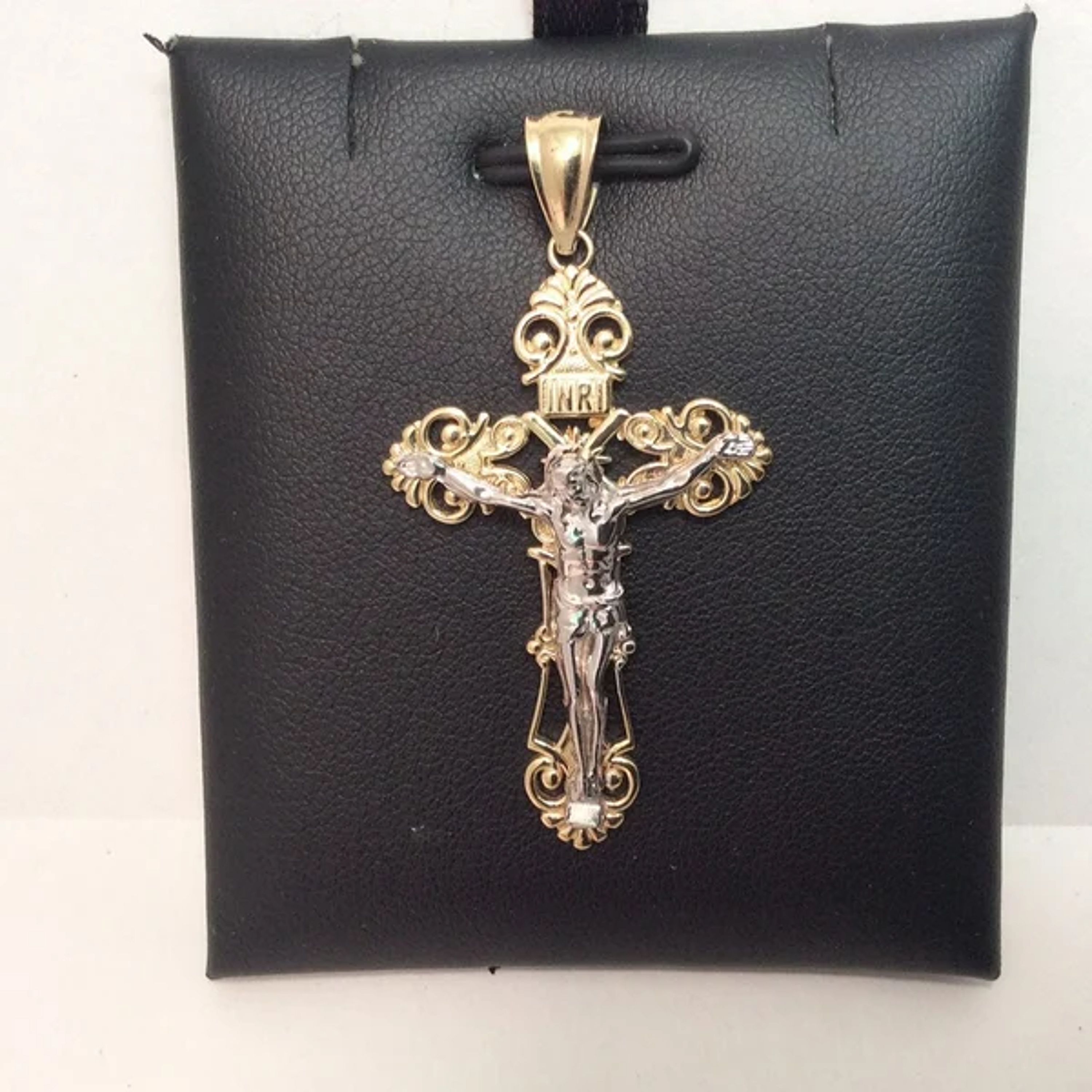 10K Two Tone Real Yellow Gold Fancy Crucifix Cross Charm Pendant 5.00 grams Metal Type: 10K Solid Yellow Real Gold Weight: 5.00 Grams Width: 1 Inch Wide Length: 2 Inches Long with bail comes with a gift box
