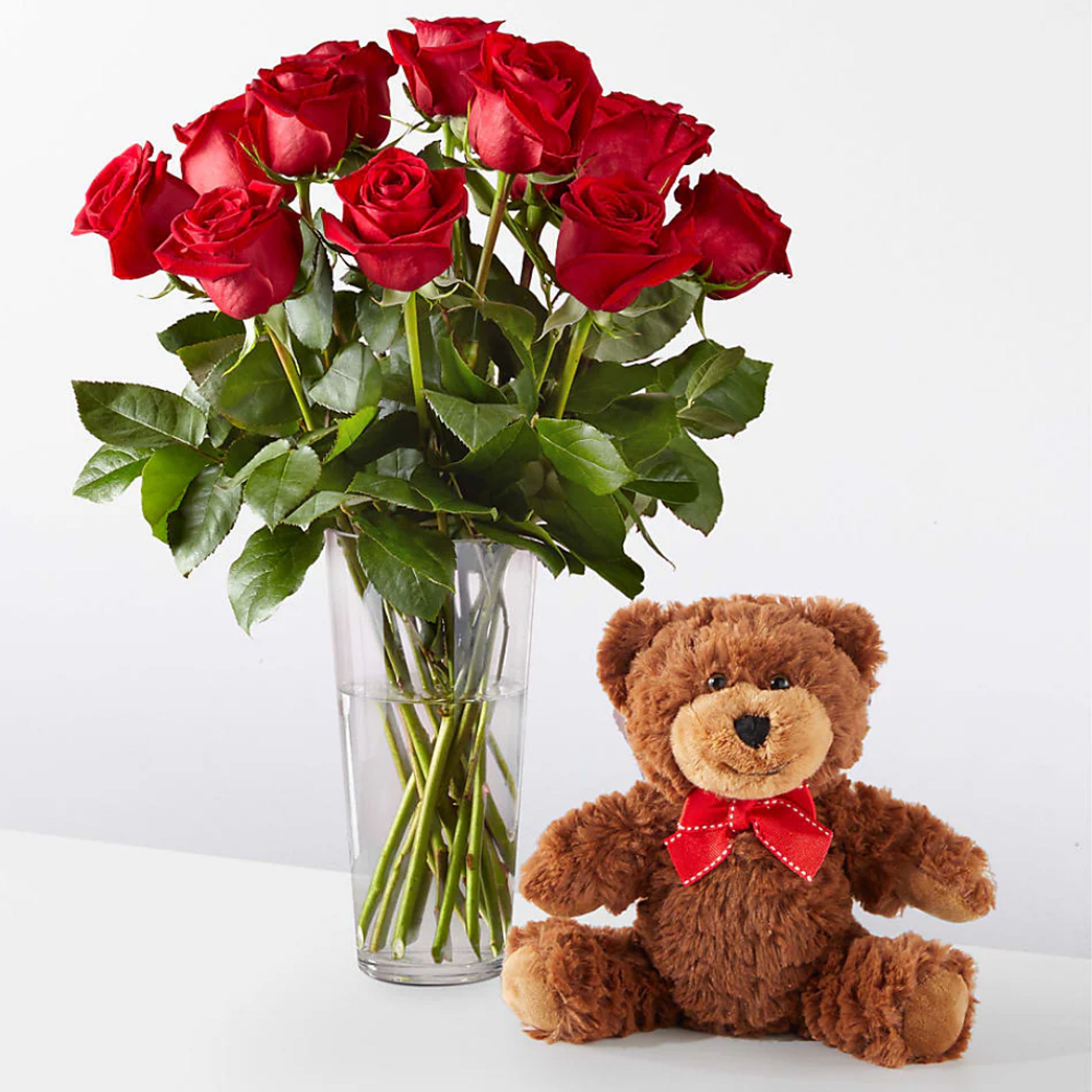 A bouquet of 18 roses and foliage paired with a plush bear.