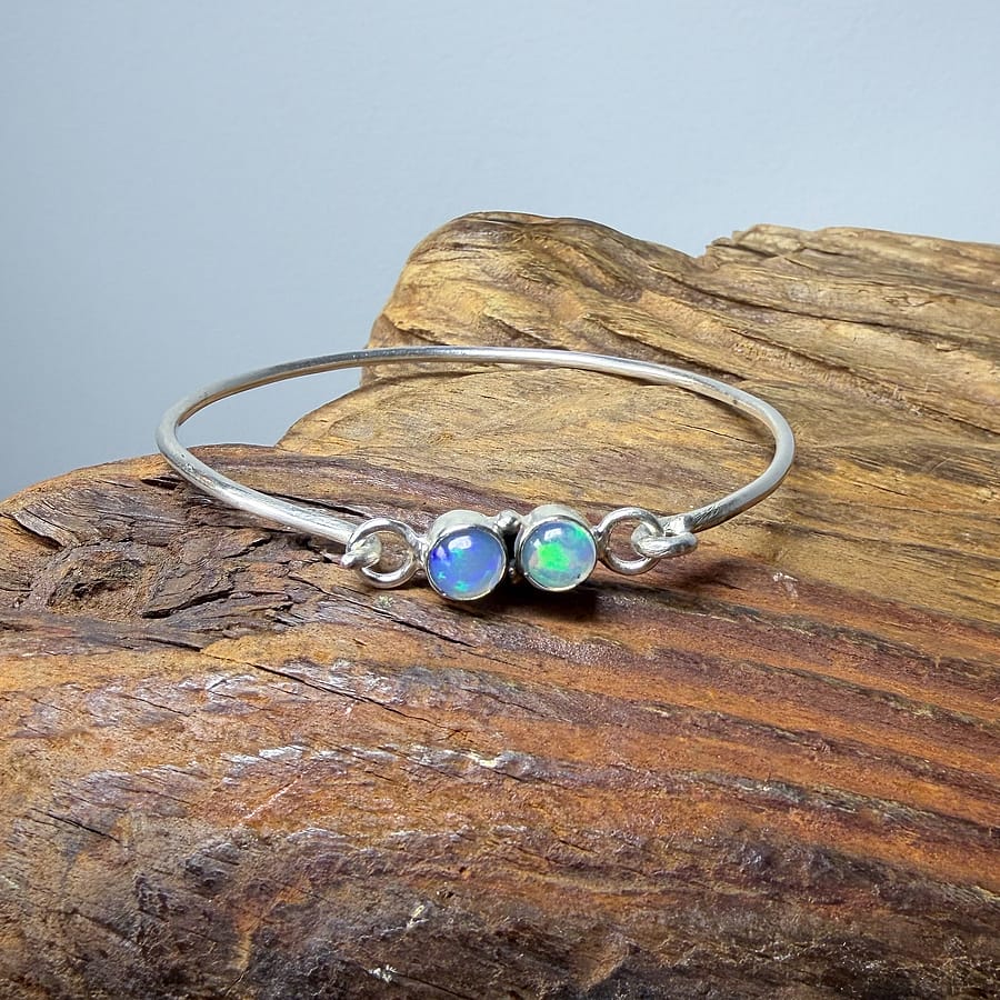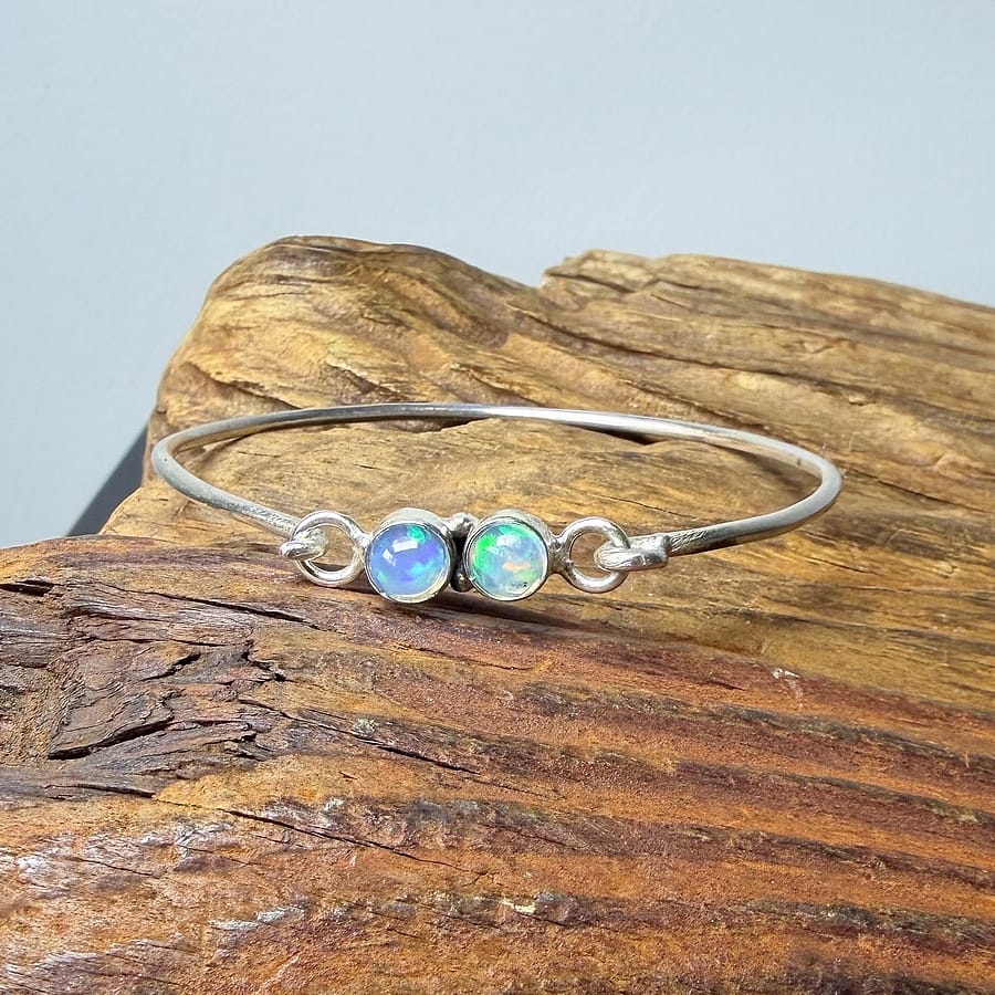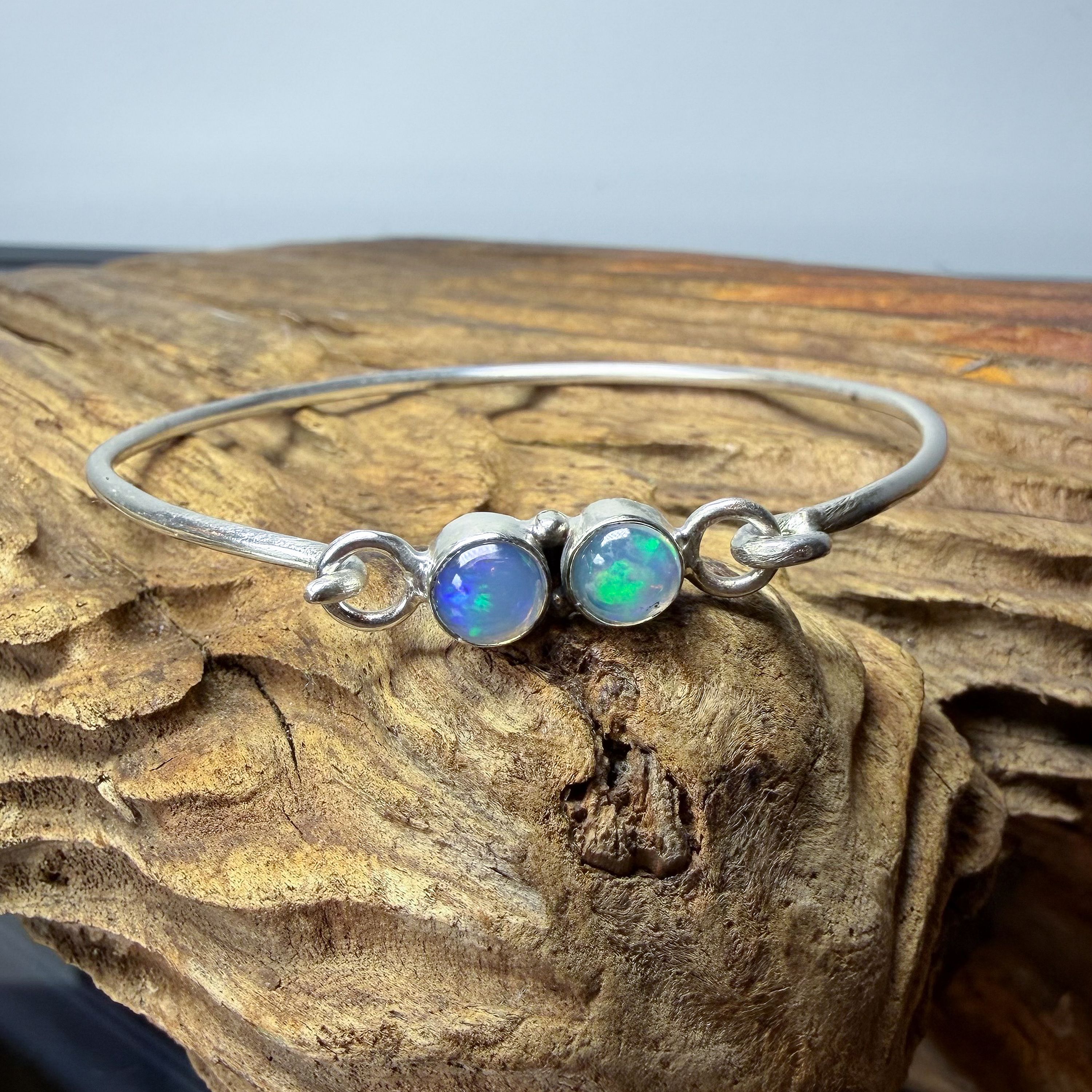 This handcrafted bangle features two genuine Ethiopian opals that shimmer with flashes of ocean blues, soft greens, and subtle hints of violet. Each opal is naturally unique, creating a one-of-a-kind play of color that changes beautifully in the light.
