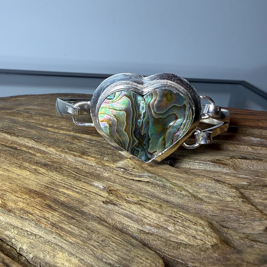 Romantic, radiant, and truly one of a kind. This stunning bangle features a heart-shaped natural abalone shell centerpiece, glowing with layers of oceanic greens, blues, golds, and soft violet tones. Each natural wave and shimmer in the shell creates a mesmerizing pattern that can never be duplicated.