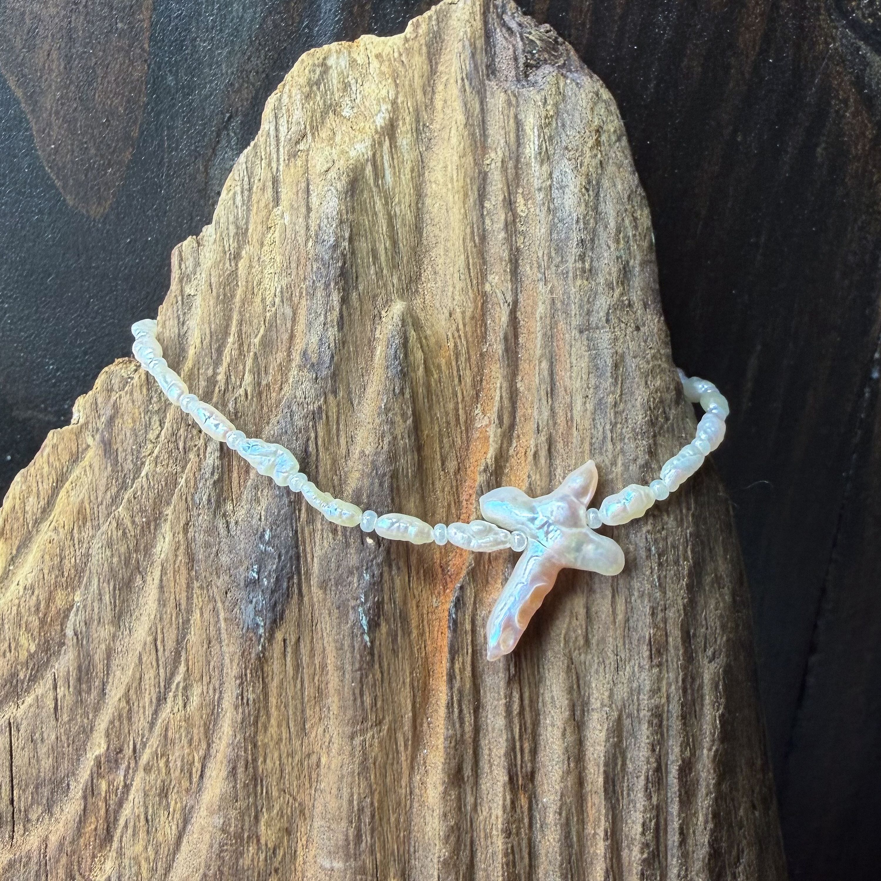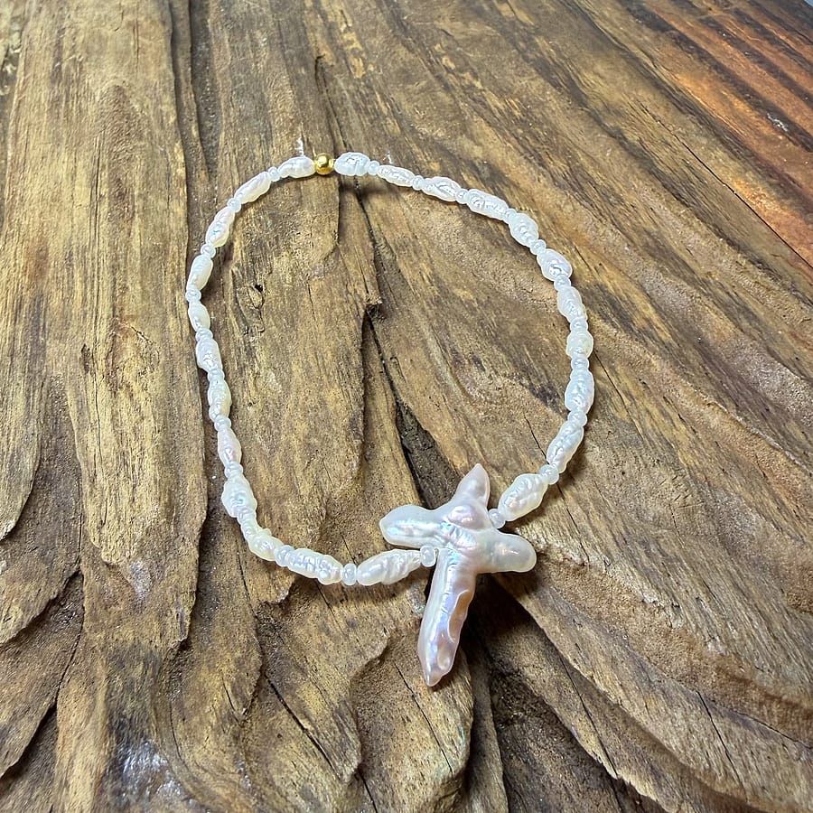 A beautiful blend of meaning and coastal elegance, this statement bracelet features luminous genuine rice pearls accented with a striking natural cross-shaped pearl centerpiece. Each pearl glows with soft iridescence, while the organic cross pearl adds a powerful and eye-catching focal point.