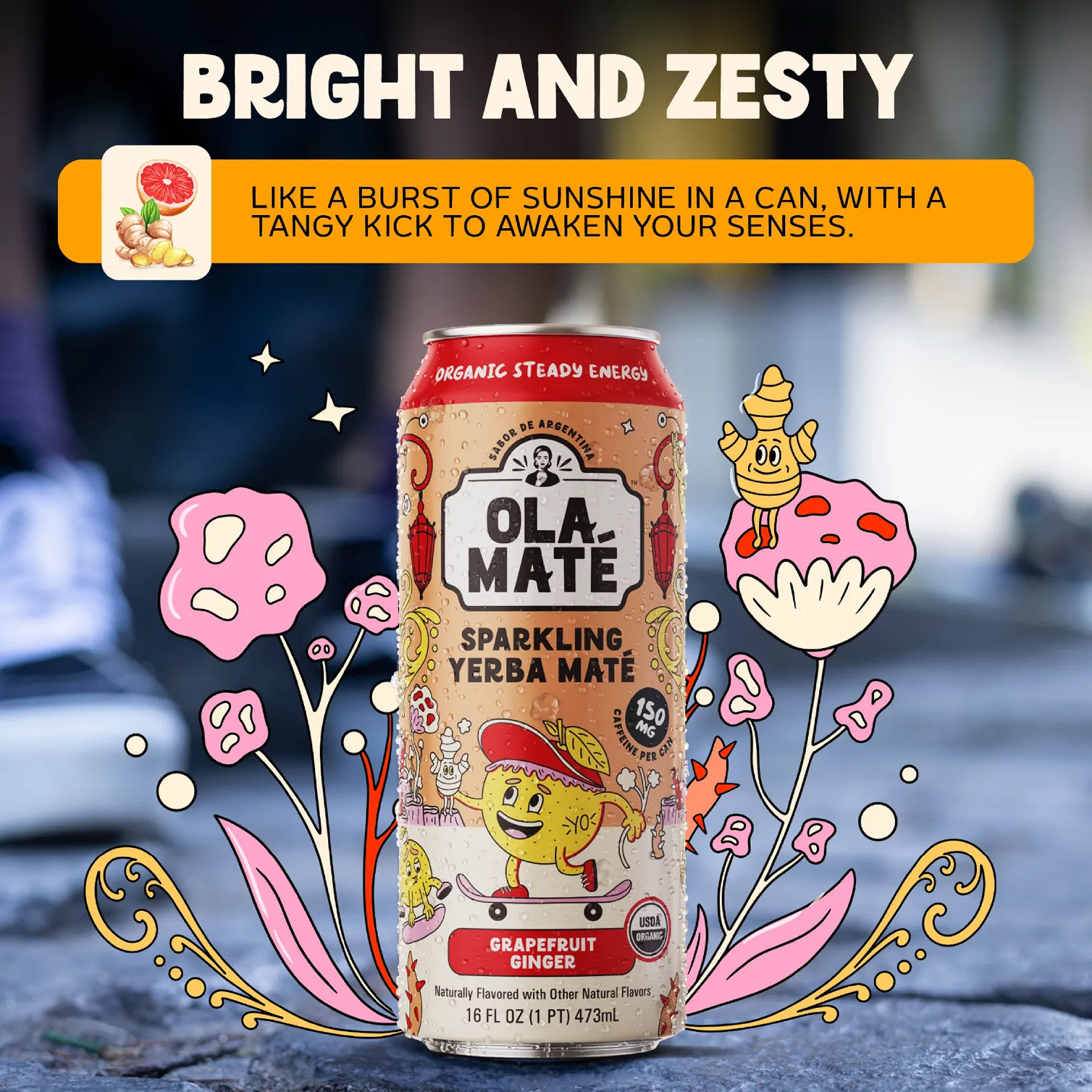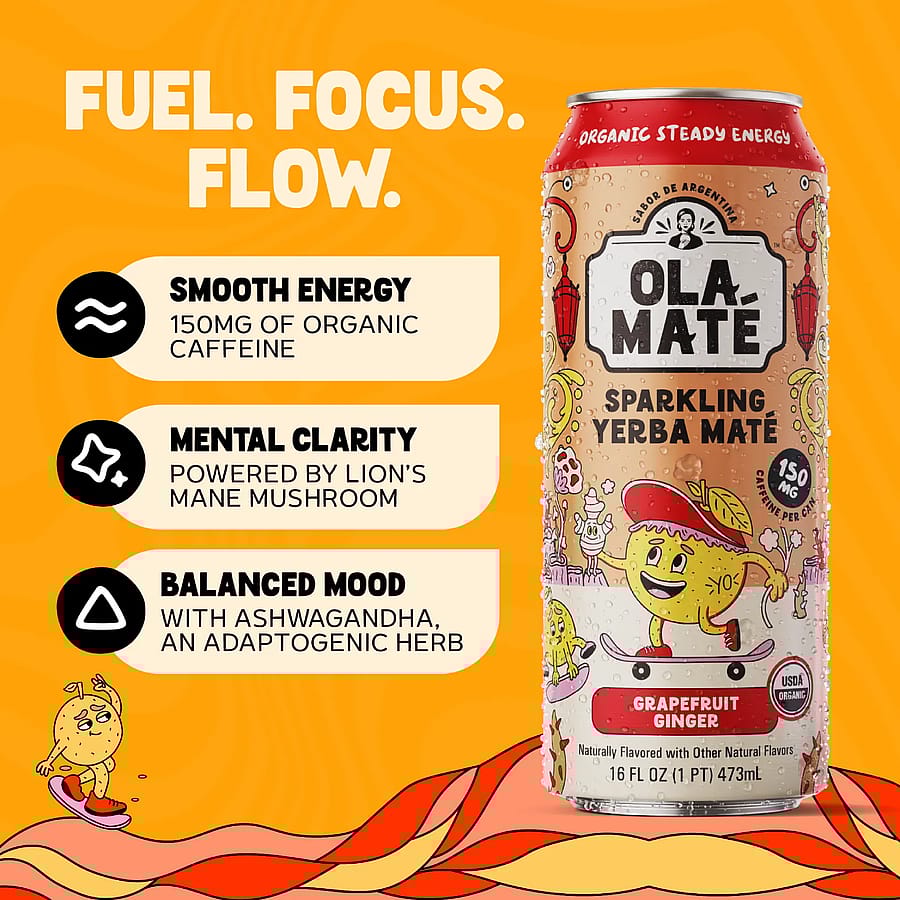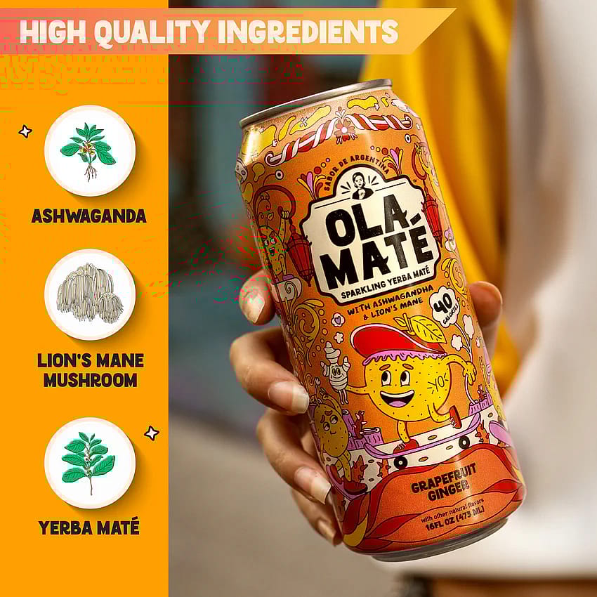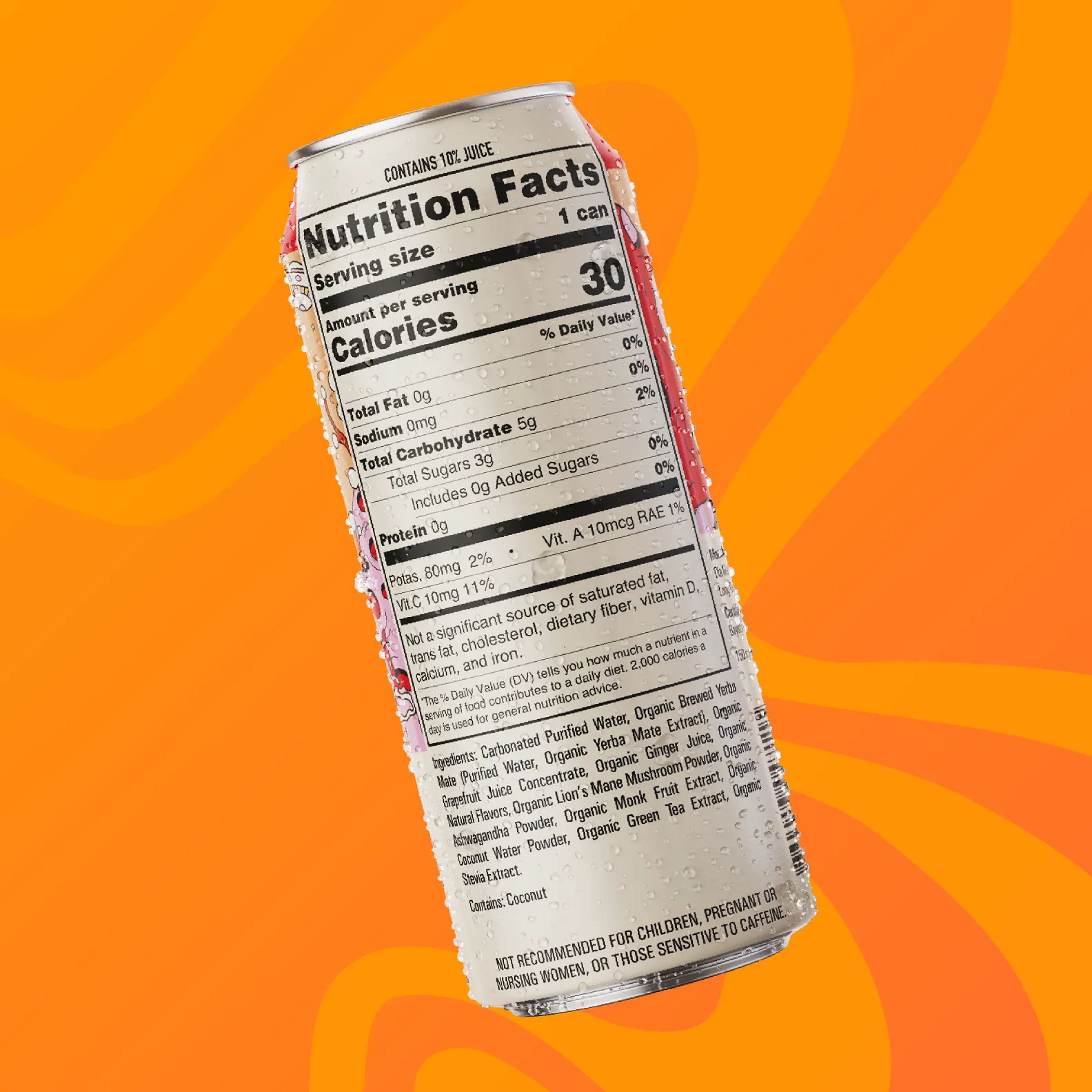 Organic Yerba Mate, Organic Grapefruit Juice Concentrate, Organic Ginger Juice, Organic Coconut Water Powder, Organic Natural Flavors, Organic Lion’s Mane Mushroom Powder, Organic Ashwagandha Powder, Organic Monk Fruit Extract, Organic Green Tea Extract, Organic Stevia Extract.