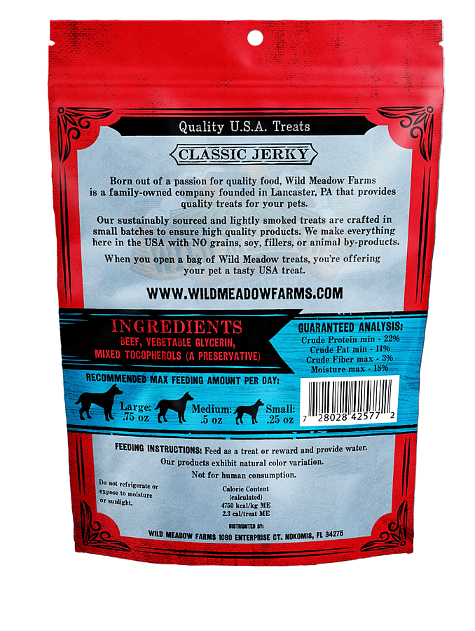 Our Wild Meadow Farms Classic Jerky Minis use the same recipes as our Classic Jerky Bites, but are crafted in a smaller size that is great to use for training, as a topper, or just treating smaller dogs. Give your dog these perfectly sized high quality, meaty training treats, and know that you are treating them right!