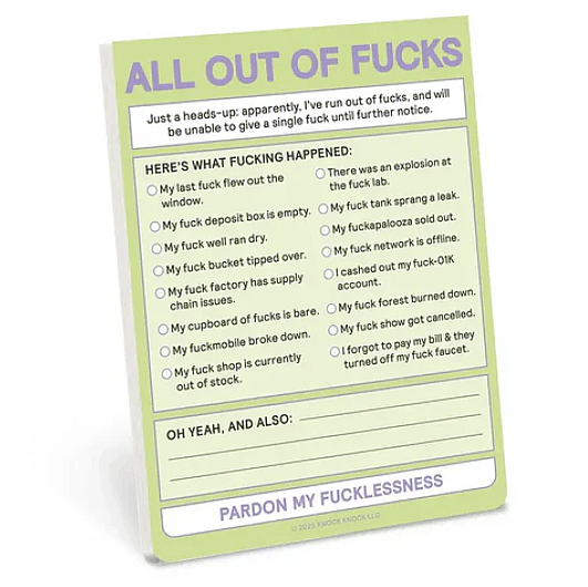 A bold and hilarious Nifty Notes pad that helps you communicate exactly how you’re feeling when you’re officially out of fucks — perfect for quick notes, memes, lists, or sharing your exasperation with coworkers and friends.