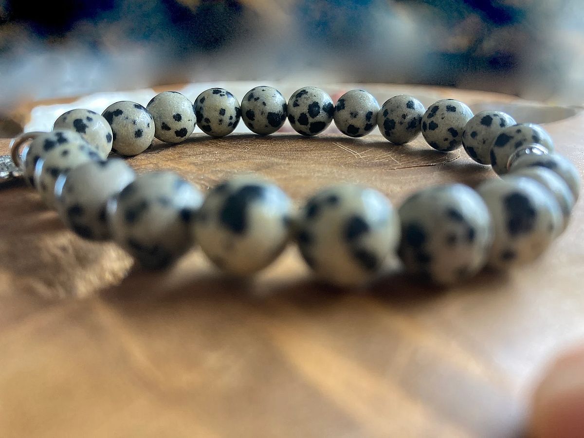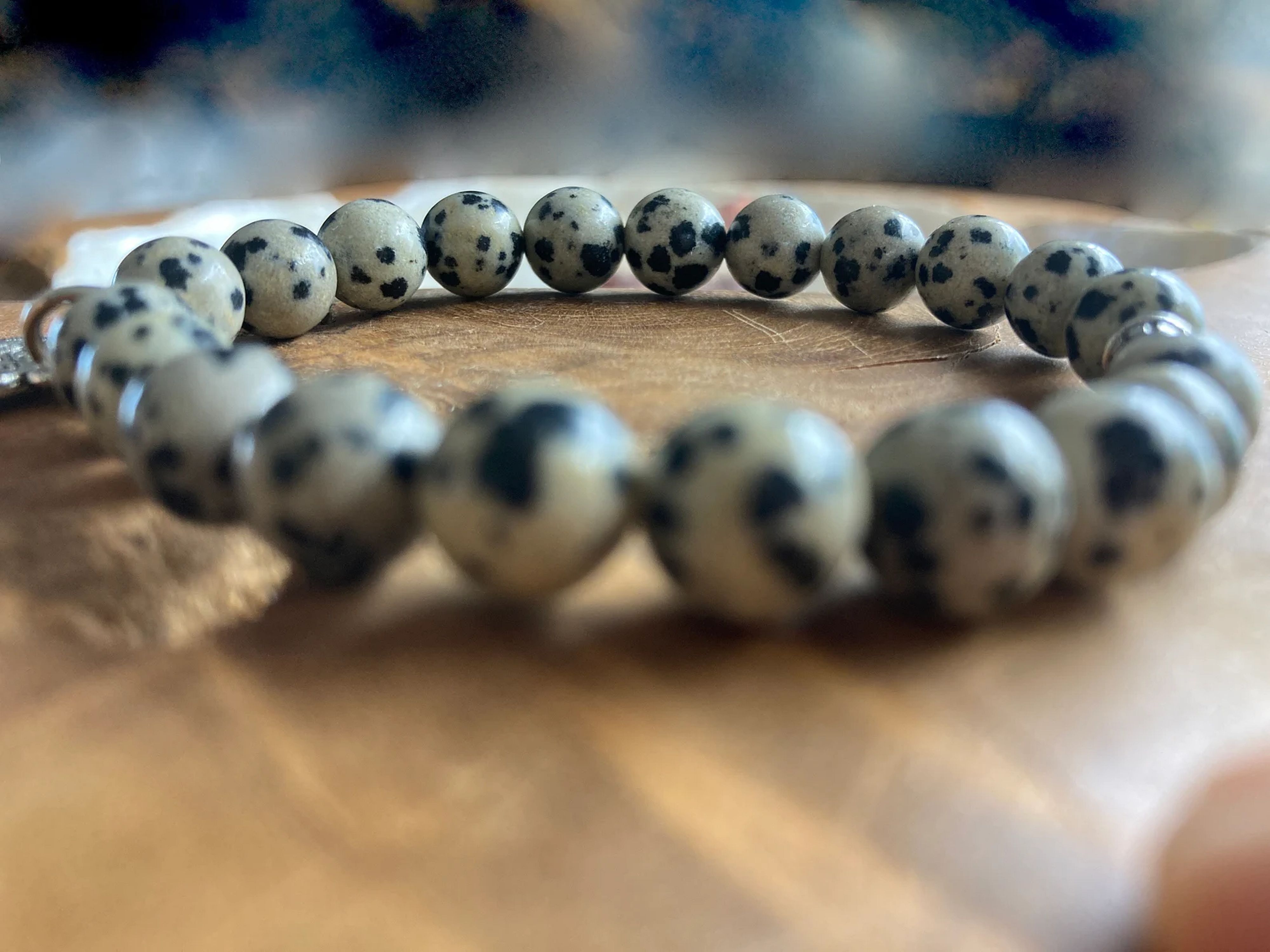 Hand made – Dalmatian Jasper 8mm, natural gemstone beads are strung on durable and stretchy, latex-free cording for a comfortable fit. Please keep in mind as with any natural product, there can be color variations in both color and natural markings, which of course adds to the character and beauty of natural stone.