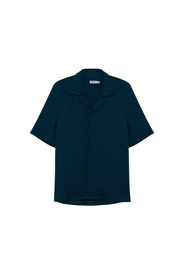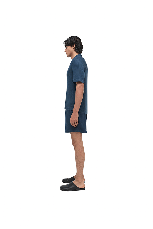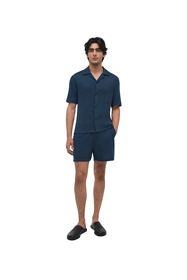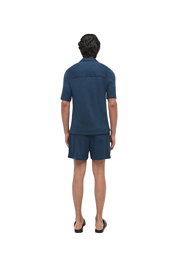 Woven from a wool-silk blend with a dimensional waffle texture, this shirt combines relaxed ease with subtle structure. The softly draped silhouette offers a polished, modern take on everyday layering. Color: Midnight