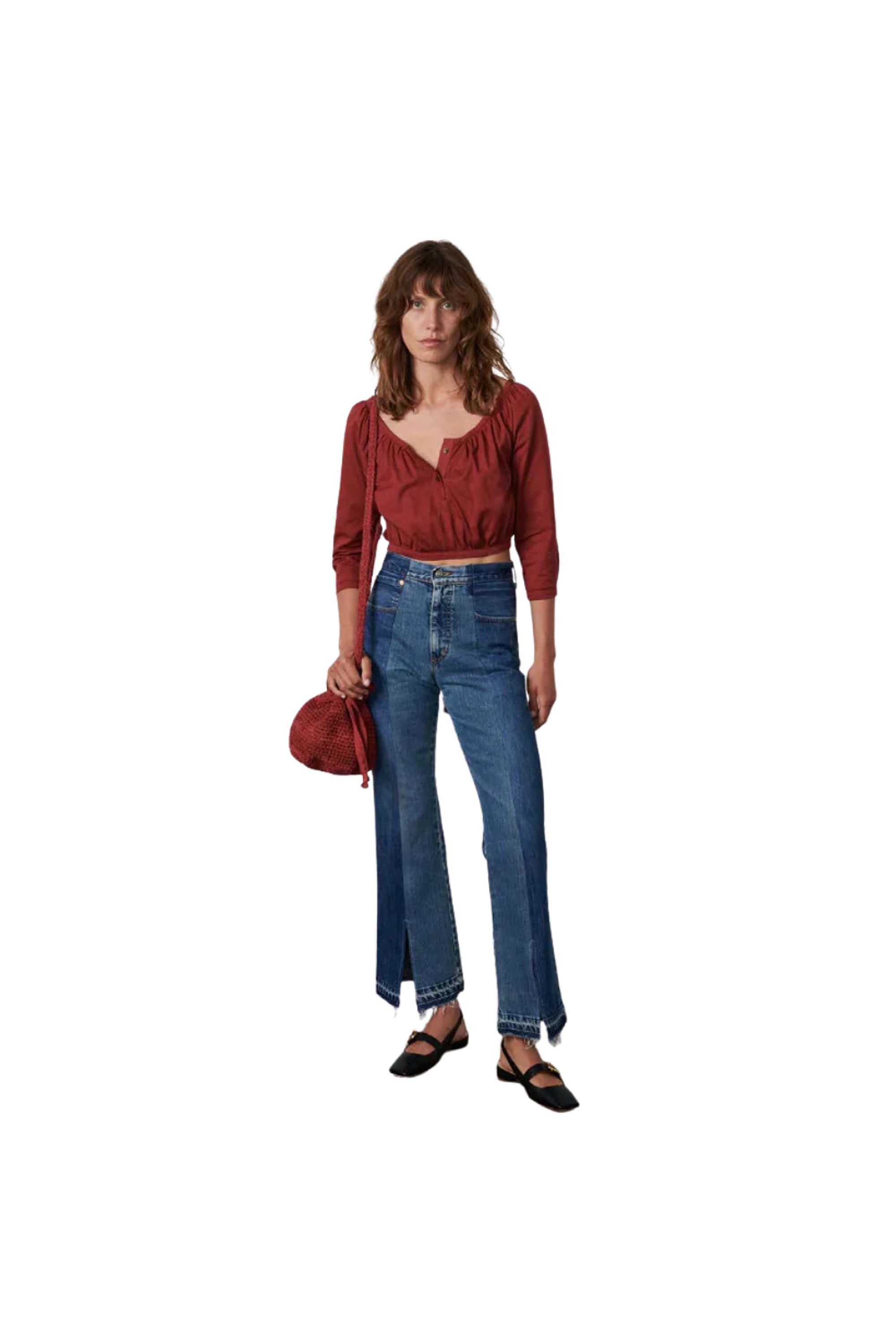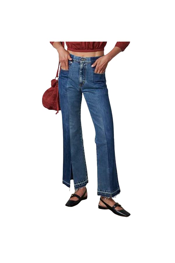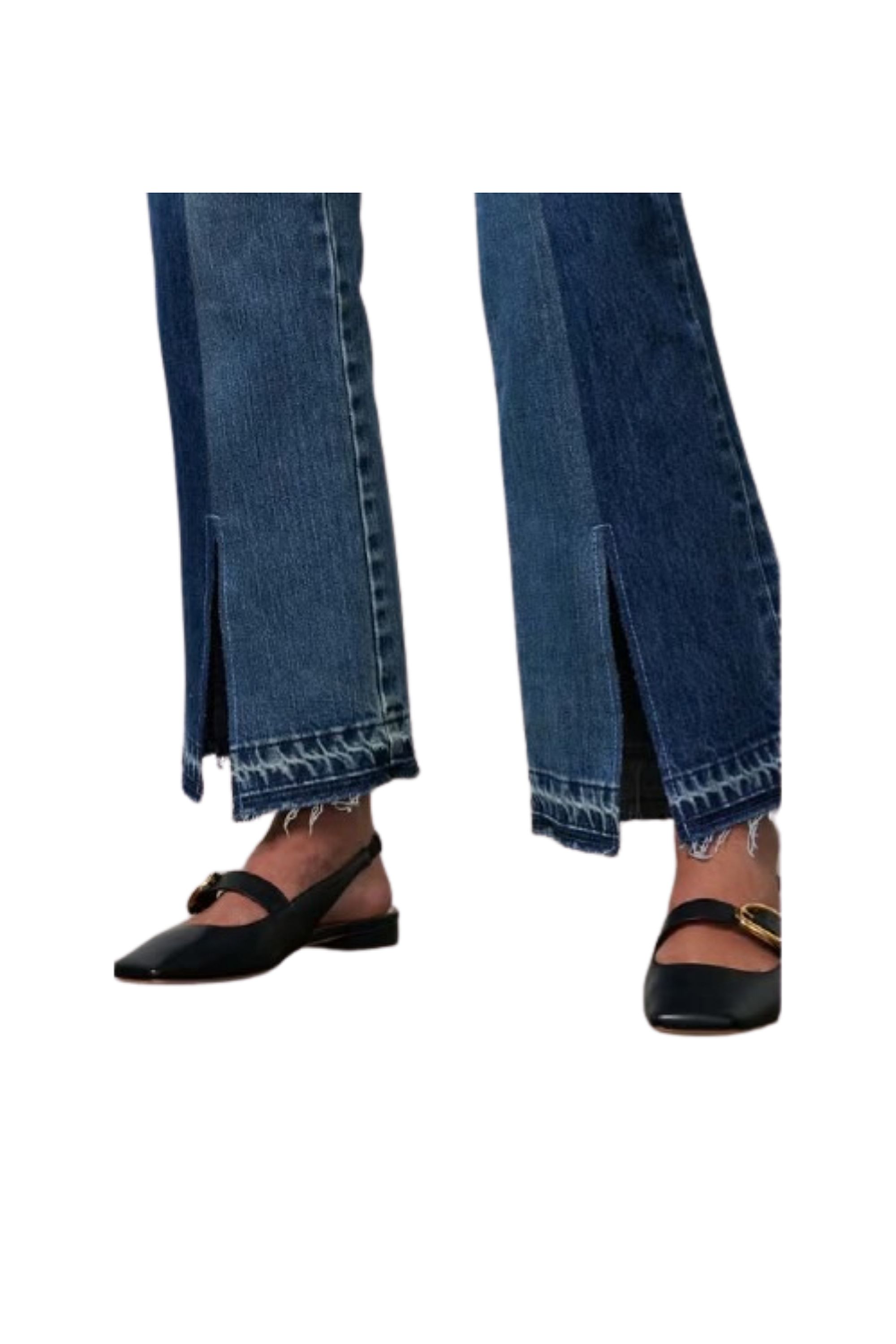 Crafted in contrasting denim tones, this ankle-length silhouette showcases an open hem and front slit detail that defines contemporary styling with refined ease of movement. Color: Mid Blue