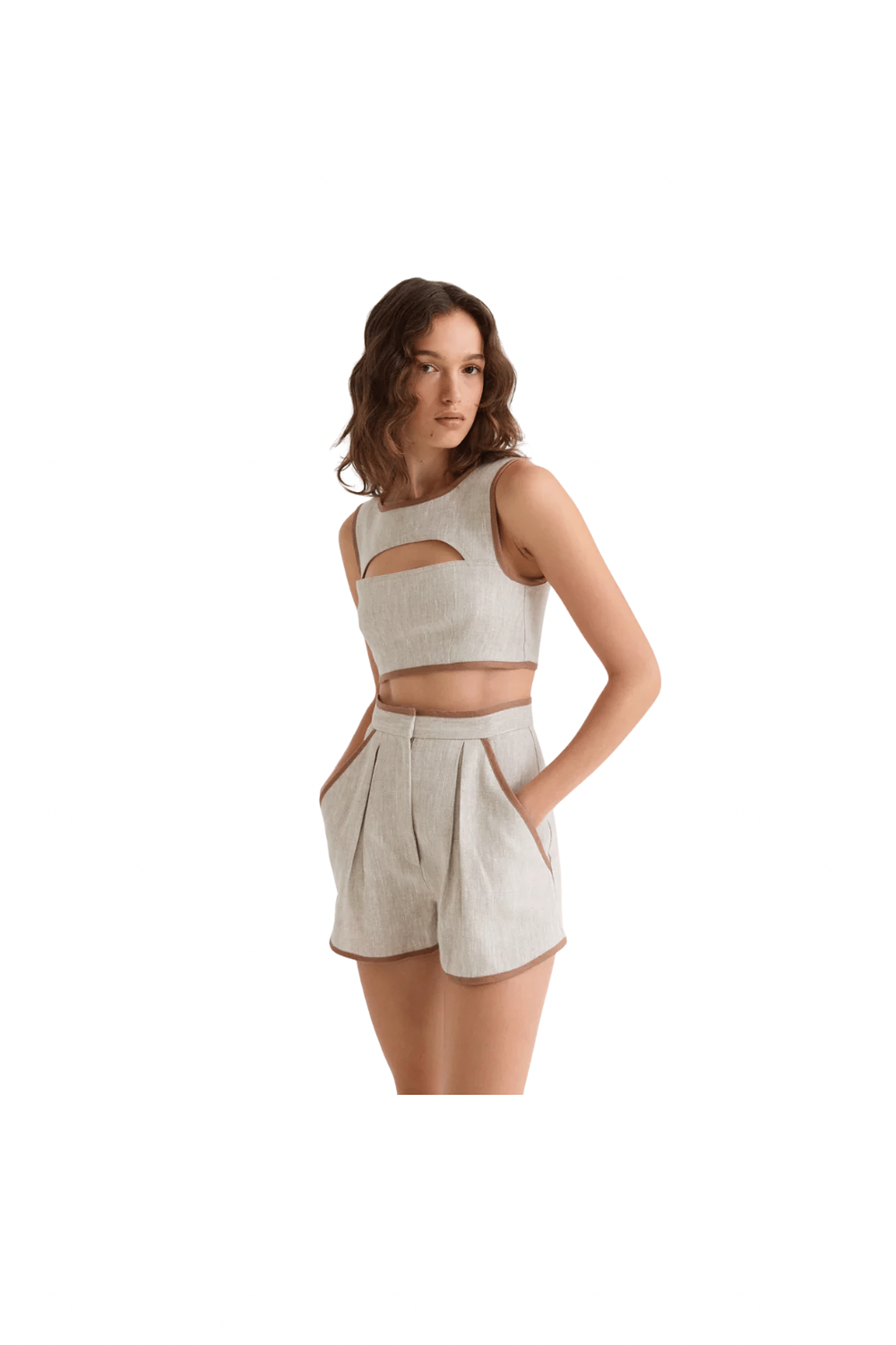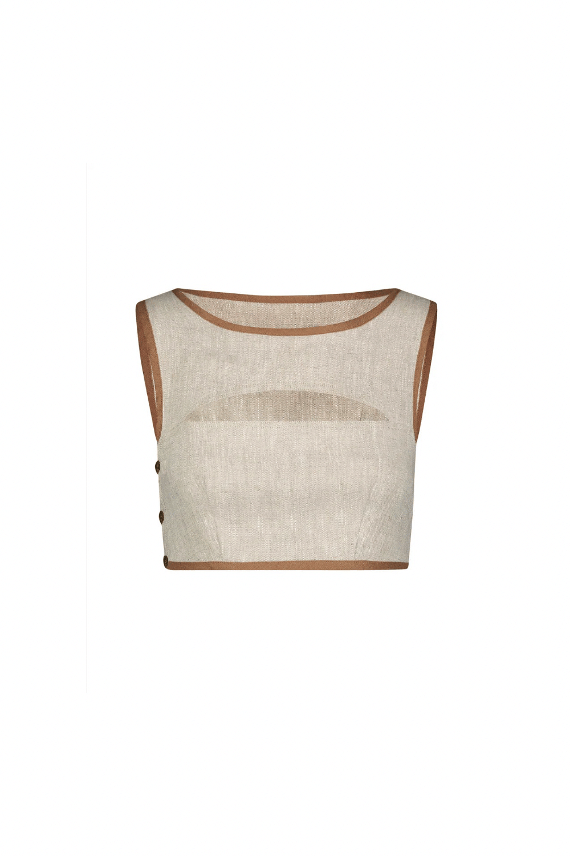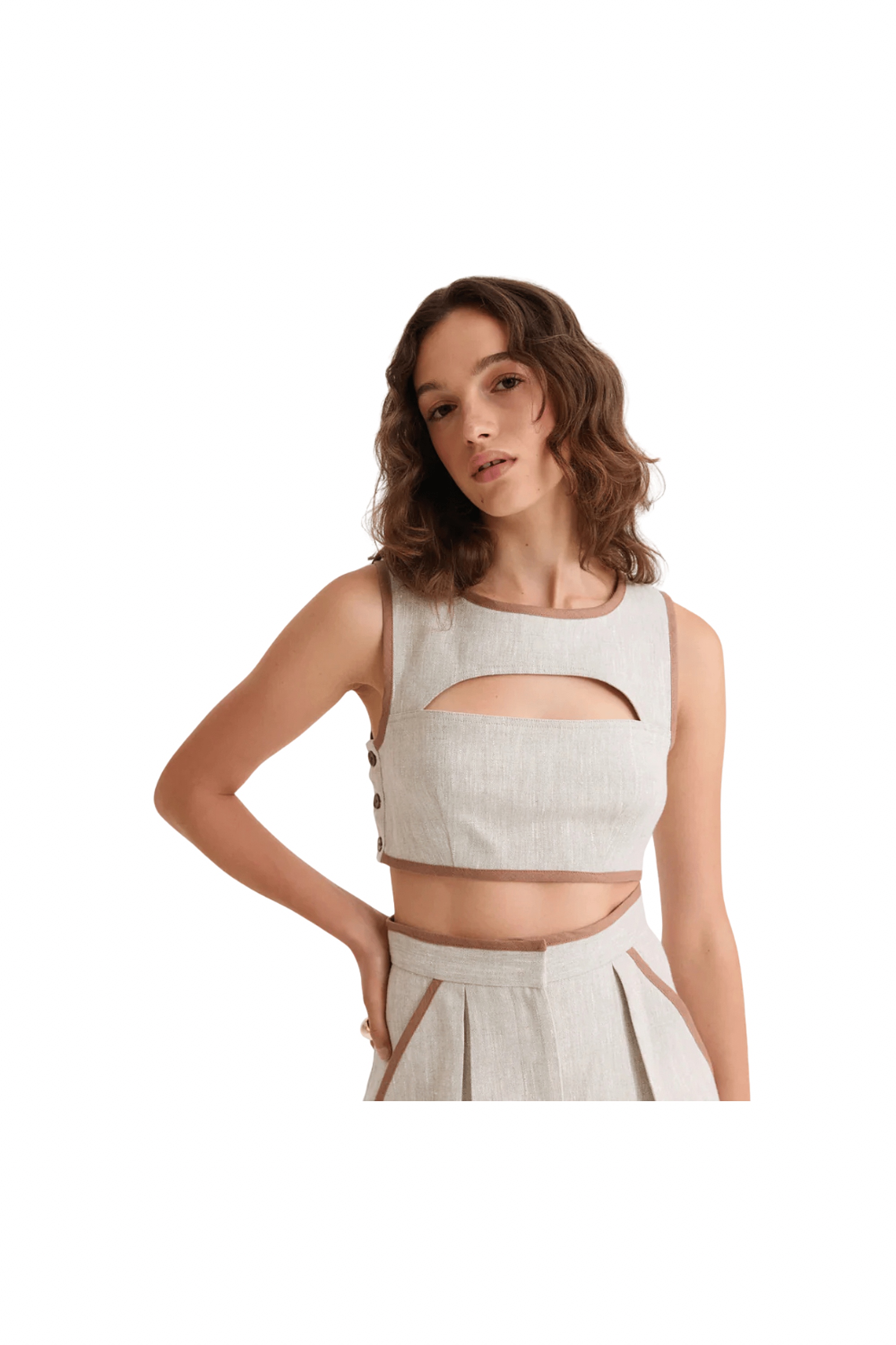Bound boat neck sleeveless crop top with peek-a-boob slit. Pair with bound pleated short to complete the look. Made in the USA Composition: 100% linen Dry Clean Model is wearing a size 0 Color: Oatmeal
