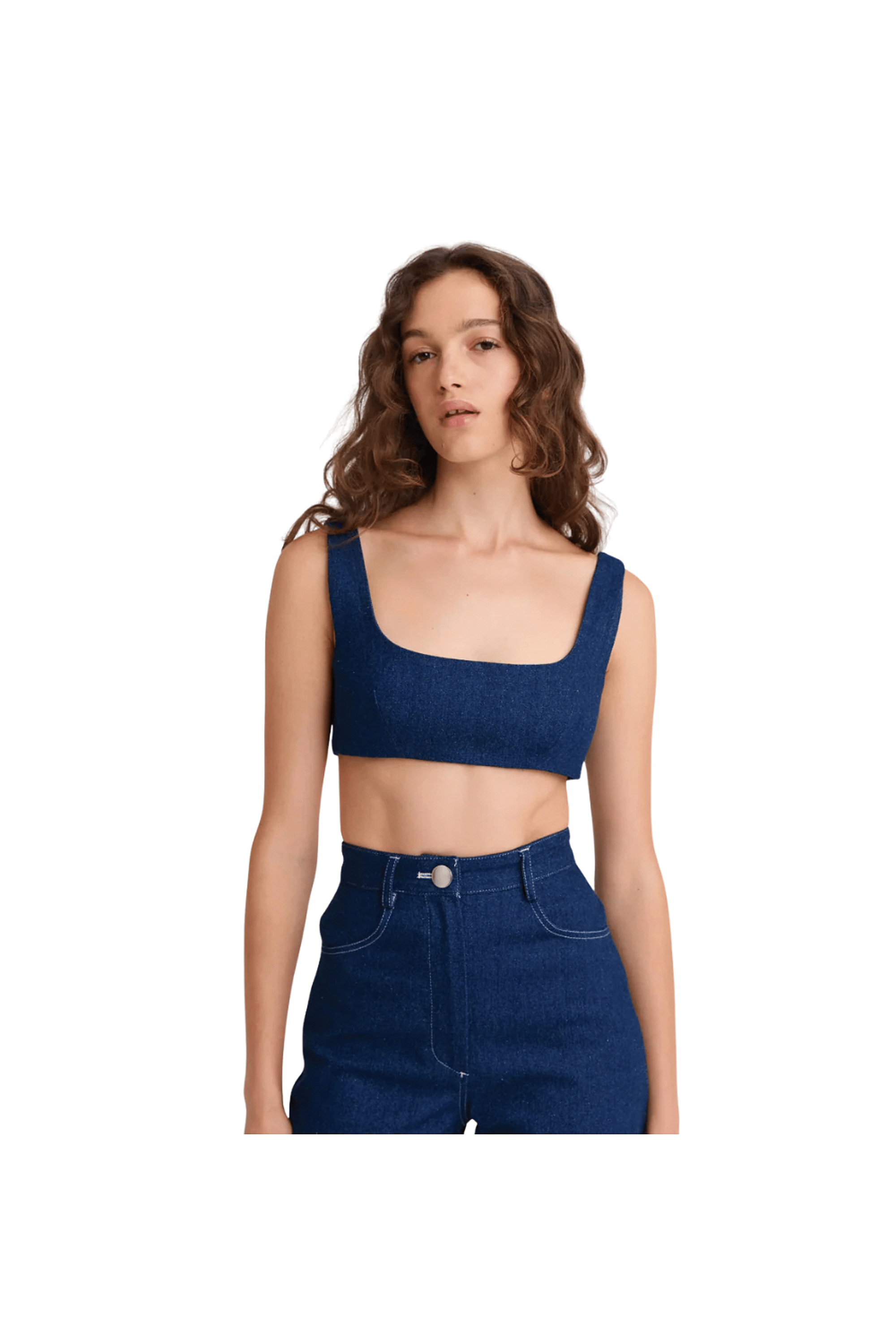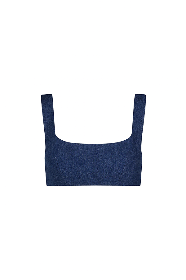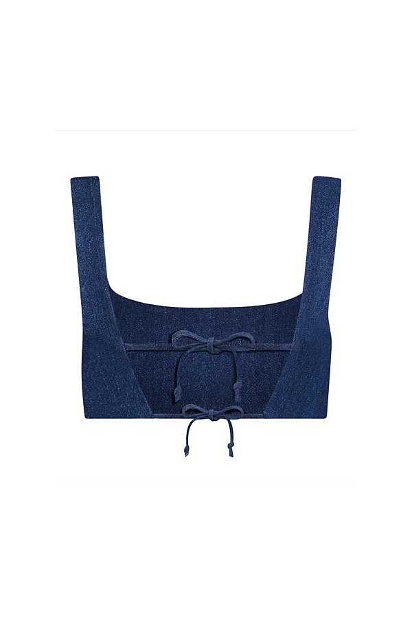 Medium wash denim bra top with tie back detailing. Pair with either the High Waist Twist Seam Jeans or the High Waist Combo Hot Short. Made in the USA Composition: 100% cotton Dry Clean Model is wearing a size XS Color: Deep Well