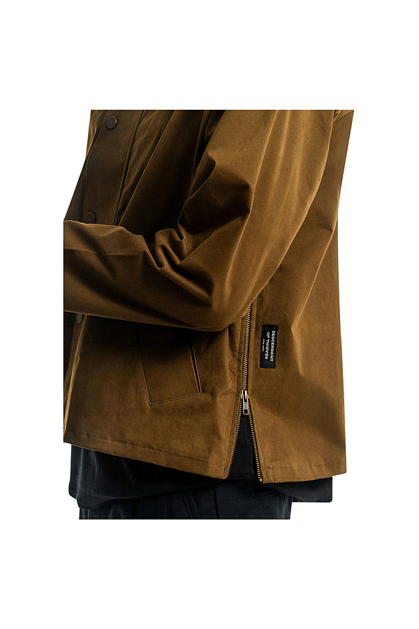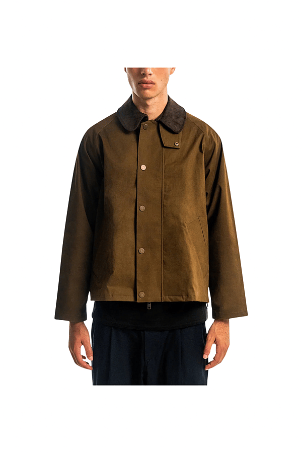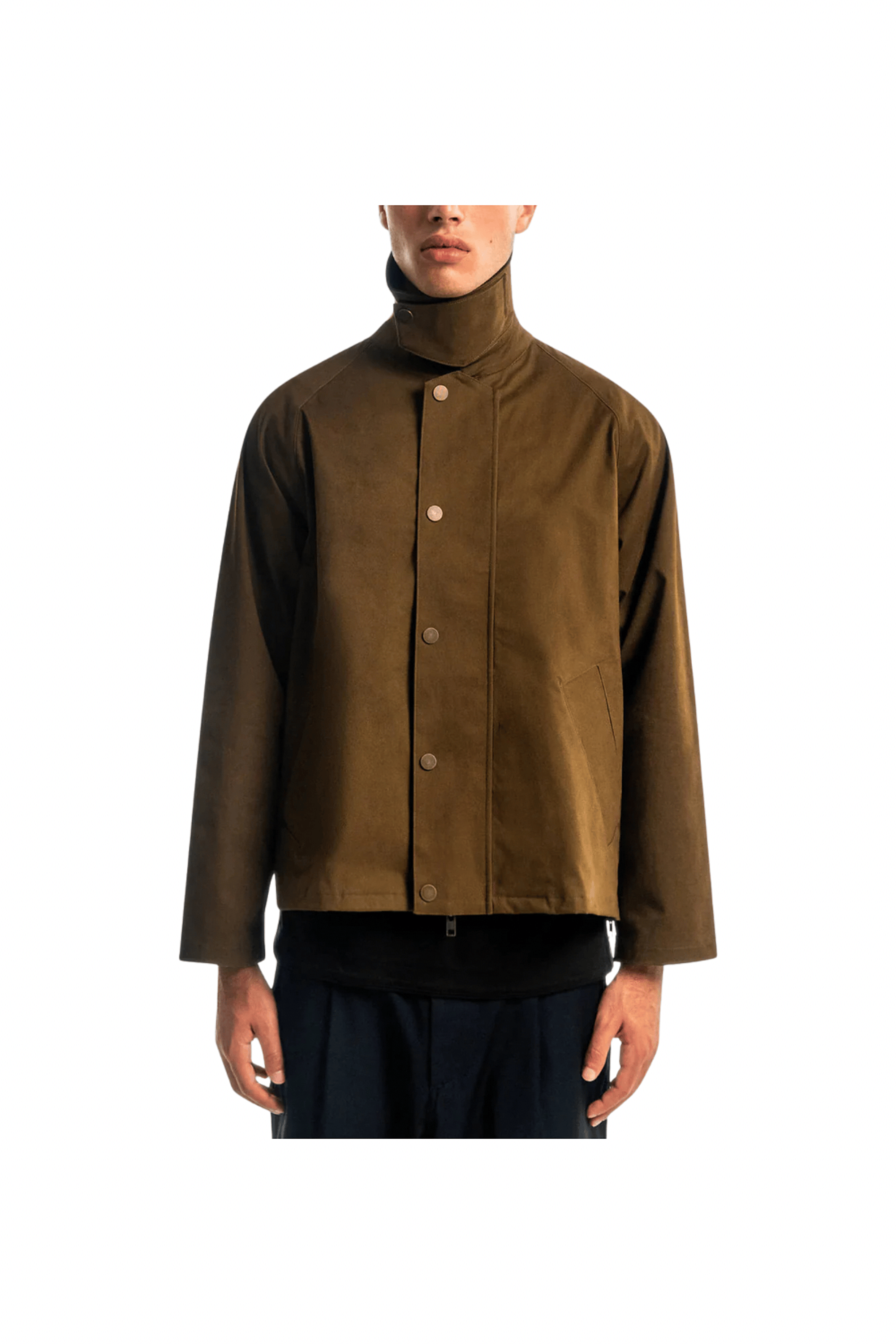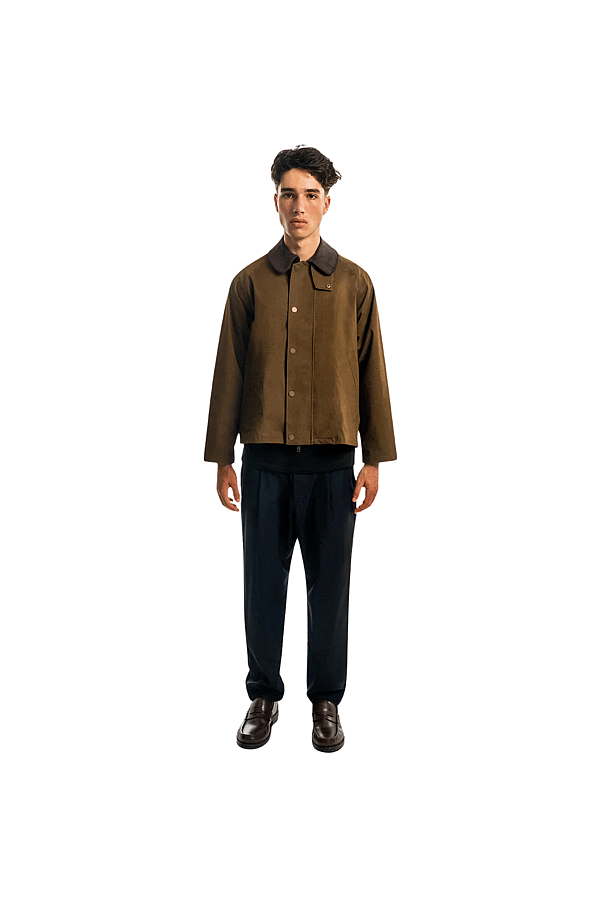 This Driving Jacket is built for movement. Walnut-colored twill, strong and steady. Cropped so it won’t bunch behind the wheel. The high collar fastens clean, folds down when not in use. Raglan sleeves add ease. Welt pockets hold form. A clean front at first glance, but it hides a zip pocket built into the placket. Keep essentials closed and out of sight. Rounded collar in contrast fabric. Sharp hem. A shape first made for drivers. Now cut for the few. Only 130 units made. Love thy neighbor, but don’t dress like them… or drive like them.