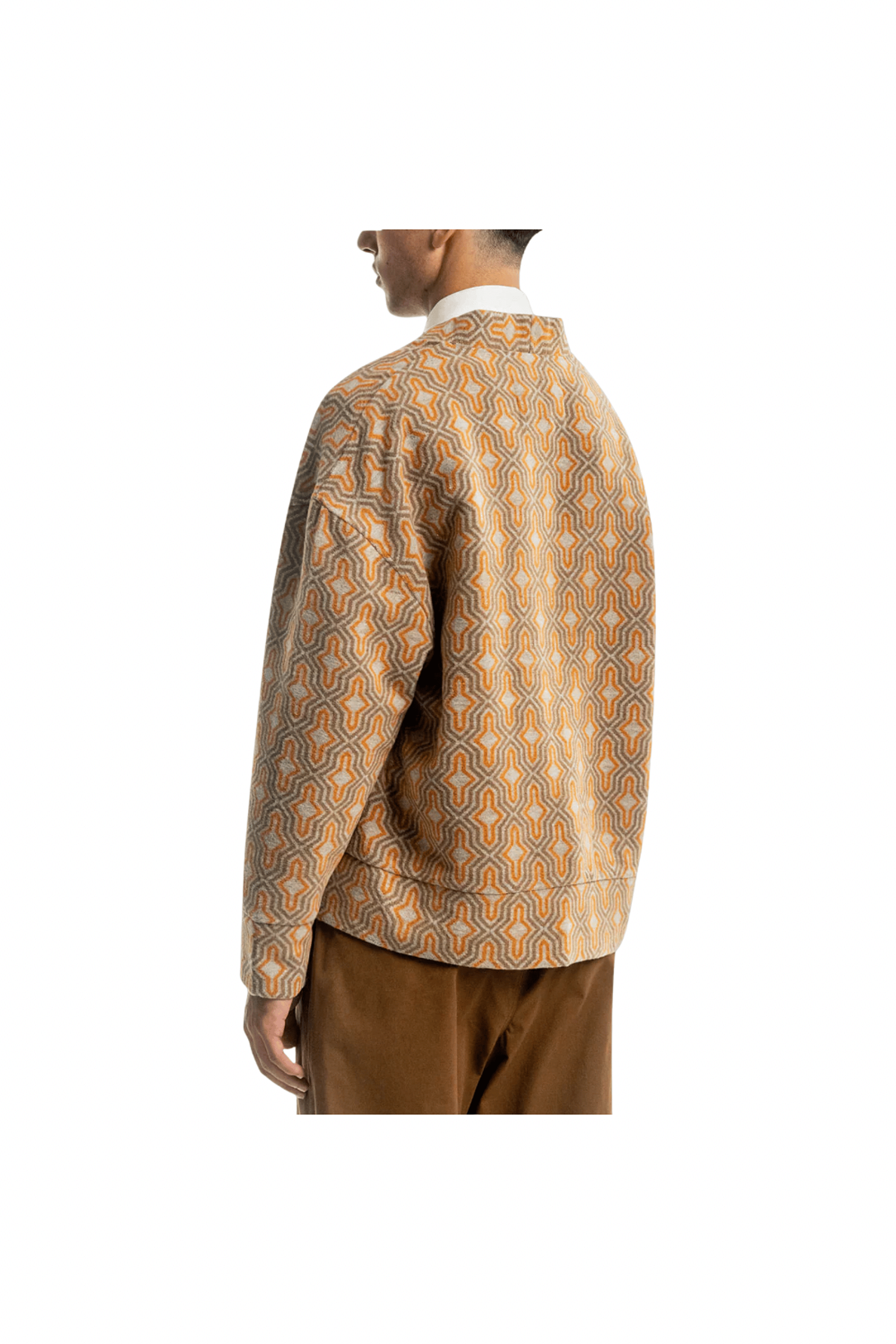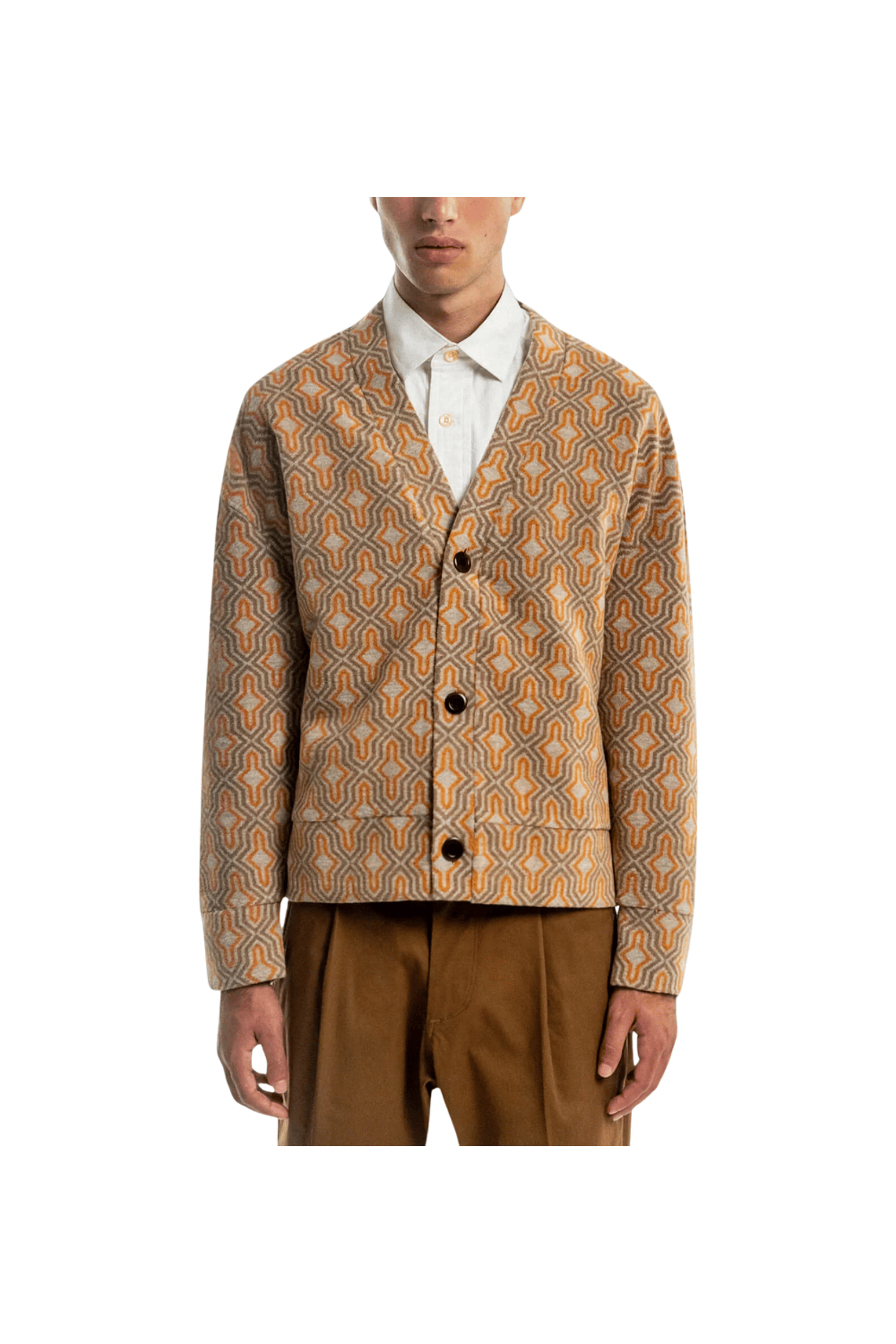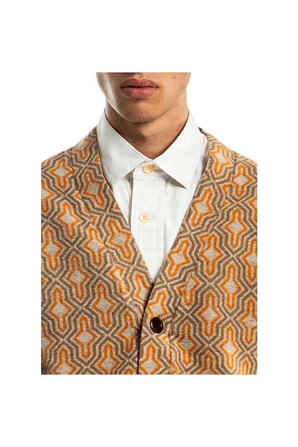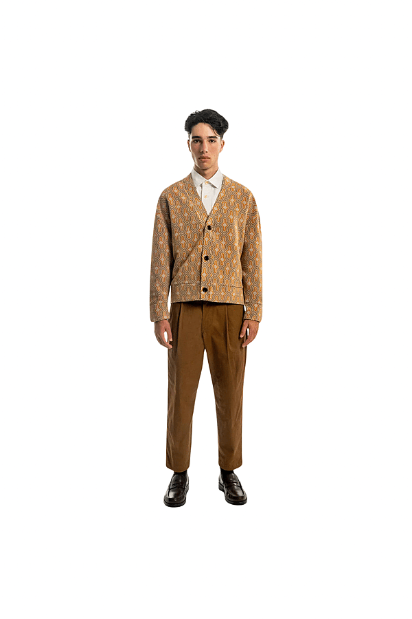 This cardigan carries an unmistakable edge. The geometric pattern pulls inspiration from mid-century interiors and underground New York style, when rules were meant to be broken and individuality ruled the room. Cut in our Aviator Fit (cropped and boxy). Finished with premium corozo buttons, hand-cut from palm nuts. Produced in small batches, because mass production doesn’t have to be for everyone.