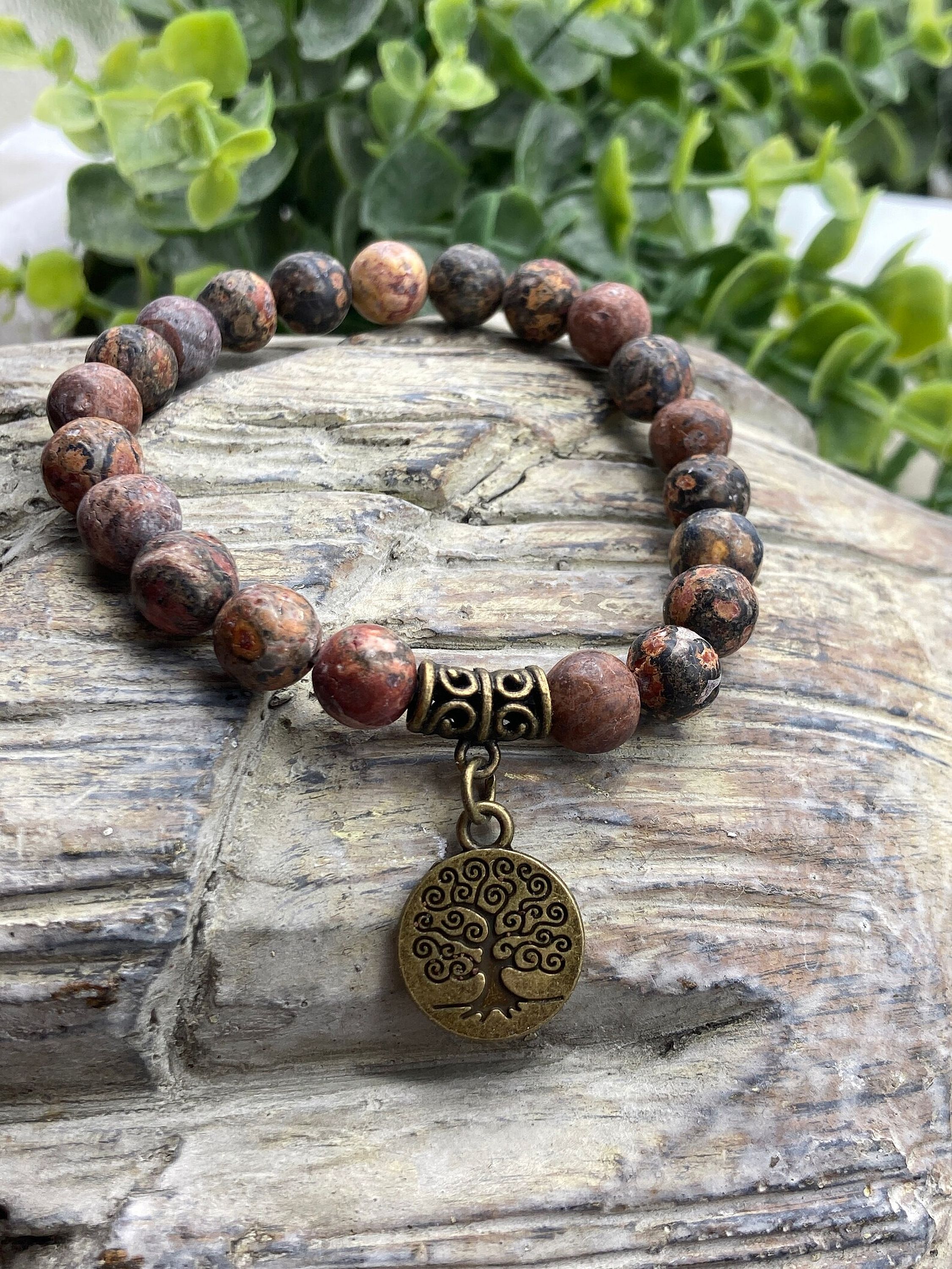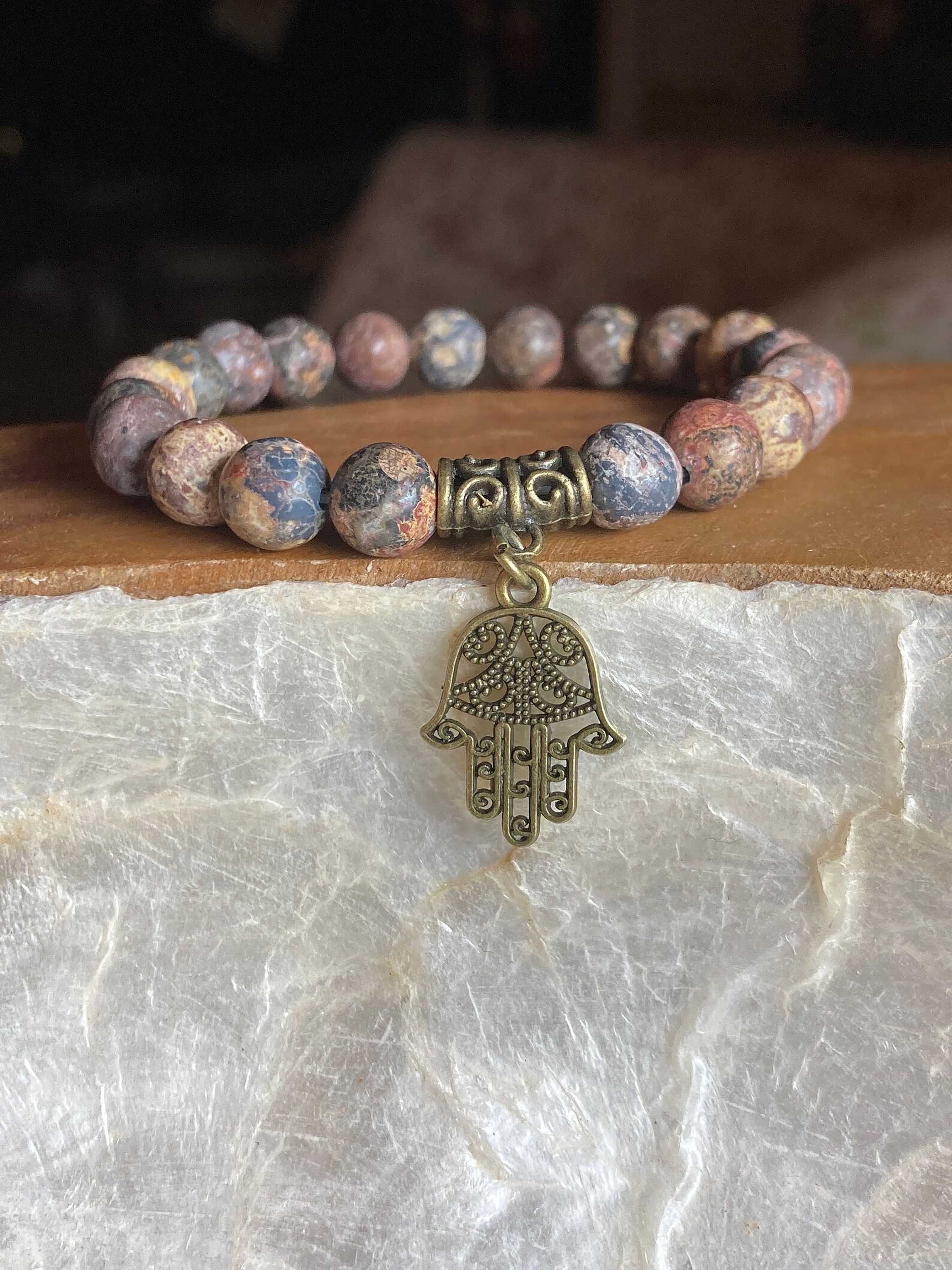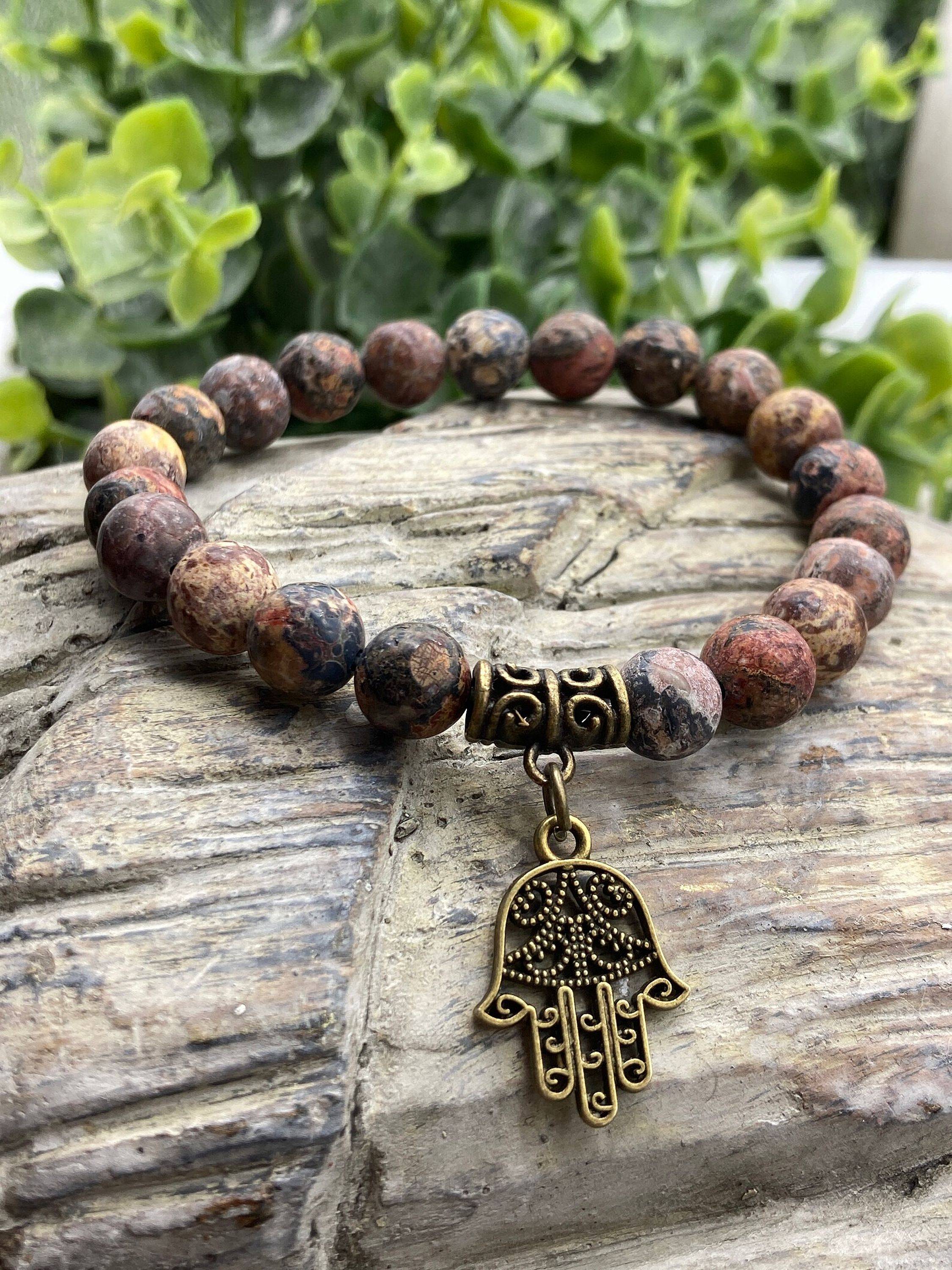 Hand made – Matte Leopard Jasper 8mm, natural gemstone beads and bronze charms are strung on durable and stretchy, latex-free cording for a comfortable fit.