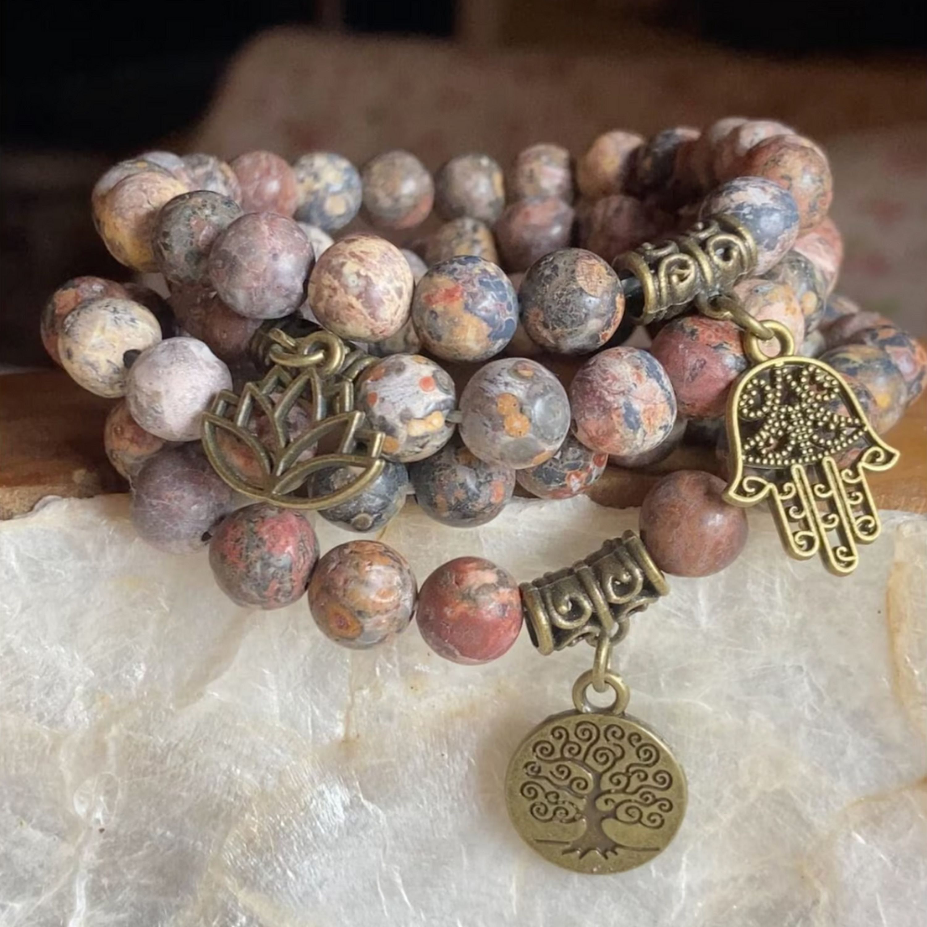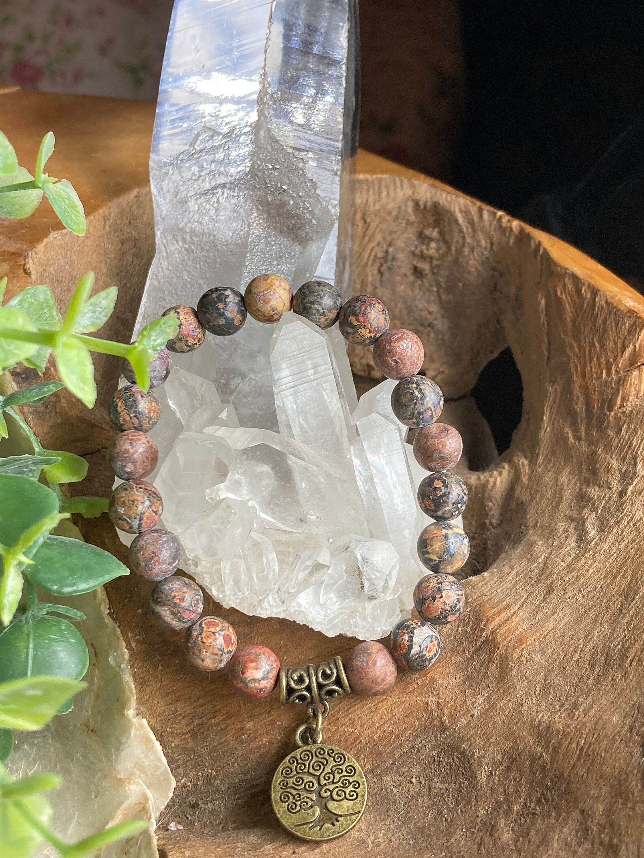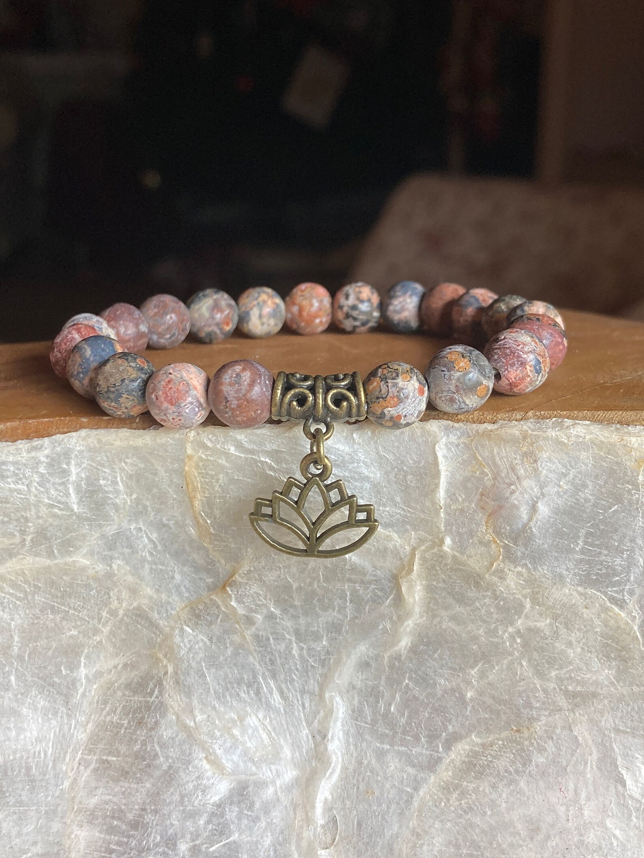 Hand made – Matte Leopard Jasper 8mm, natural gemstone beads and bronze charms are strung on durable and stretchy, latex-free cording for a comfortable fit.