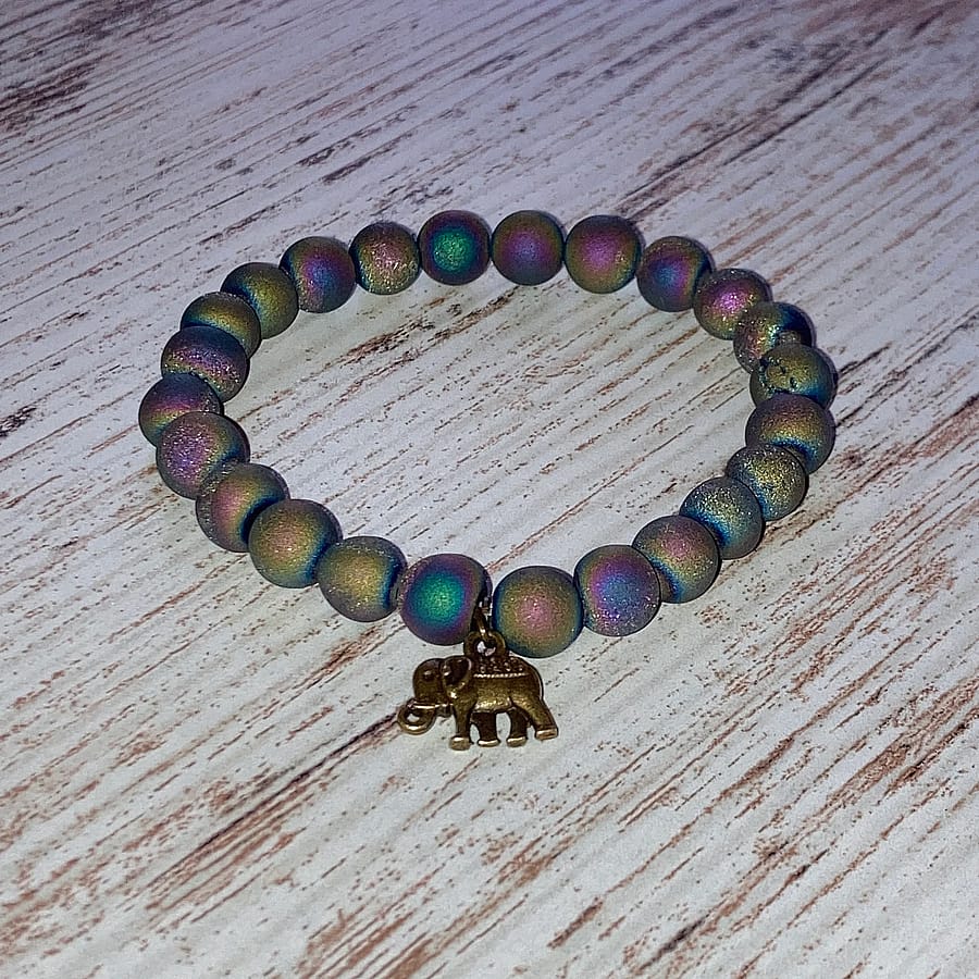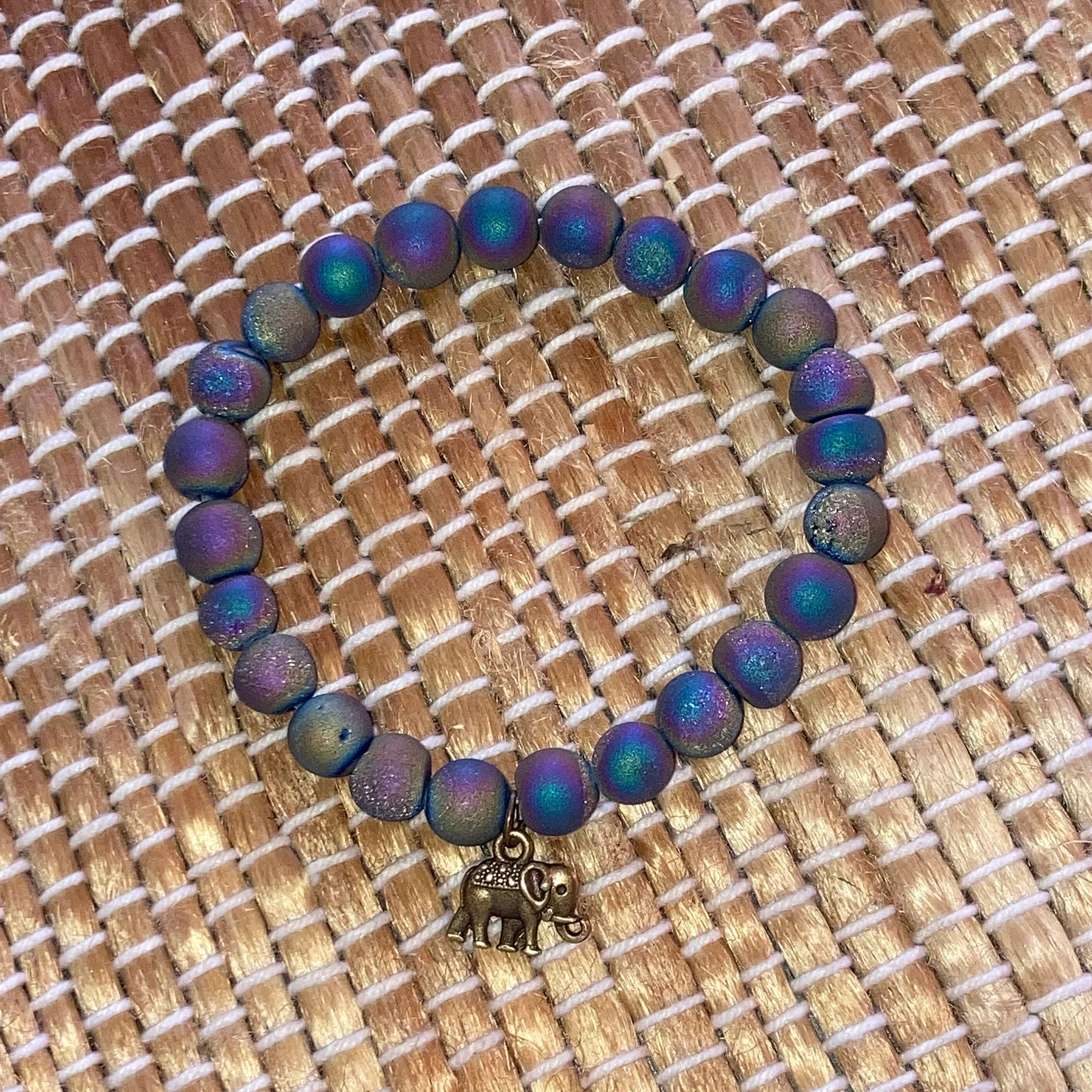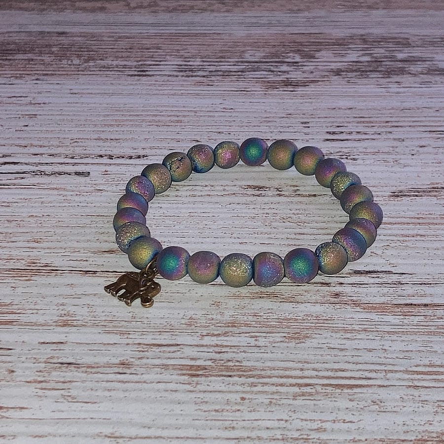 Great stocking stuffer! For Mother's Day – A stunning piece of wearable art. This 8mm Rainbow Titanium Quartz beaded stretch bracelet is magical! It displays many beautiful, cosmic-like colors with speckled hints of quartz shining through. The bronze elephant charm adds to the magnificence of these fascinating beads by incorporating a bit of luck to the wearer.